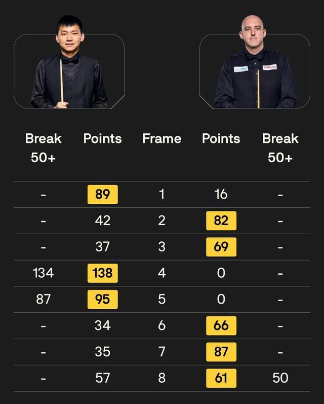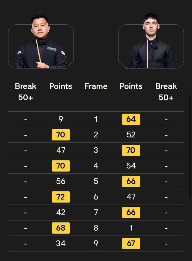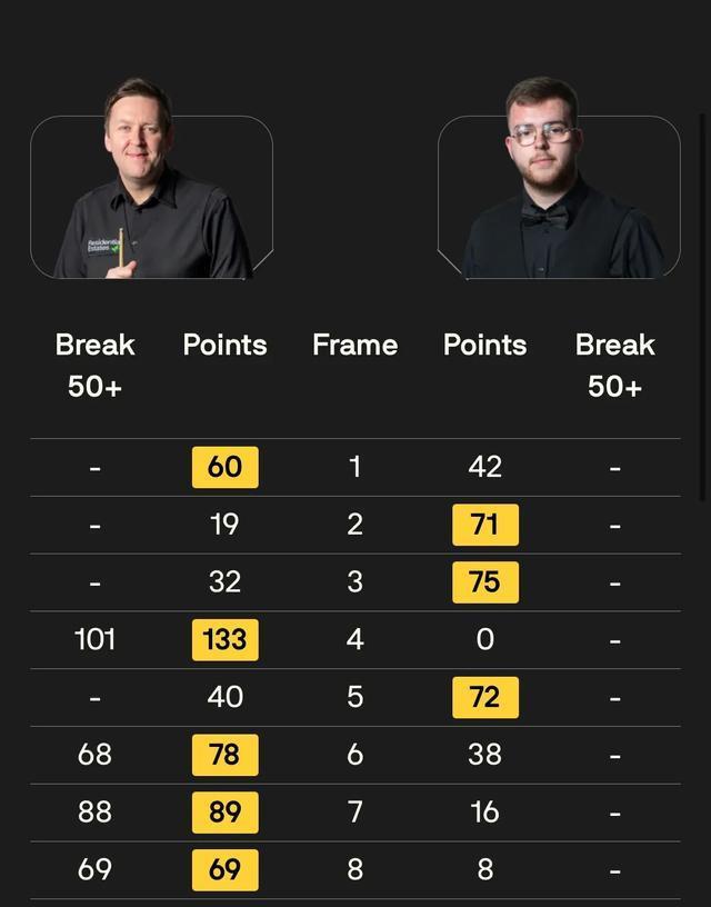 值得一提的是,在这场激烈的比赛中,乔-佩里与罗斯-缪尔的较量堪称经典。乔-佩里世界排名第62,生涯曾获得两个排名赛冠军,实力不俗。而罗斯-缪尔世界排名第78,生涯最好成绩是排名赛打进16强。这场比赛中,乔-佩里打出了单杆102分和69分的高分表现,但决胜局却被罗斯-缪尔多次上手完成绝杀,最终以4-5的总比分惜败。