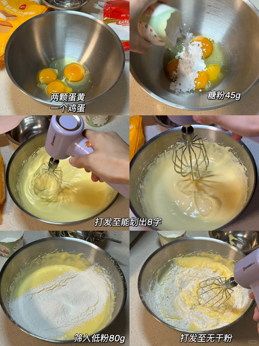 🌷食材:一个全蛋,两颗蛋黄,糖粉45g,低筋面粉80g。 🌷做法:1.大碗中打入一个全蛋,两颗蛋黄,加入糖粉,用打蛋器打发至能划8字。 2.筛入低筋面粉,用打蛋器打发至无干粉。 3.倒入裱花袋,挤入烤盘(记得一定要铺烘焙纸)。 4.烤箱提前预热,风炉模式150度烘烤20分钟。 🤤出炉后晾凉,超级香,不加一滴油就能做。