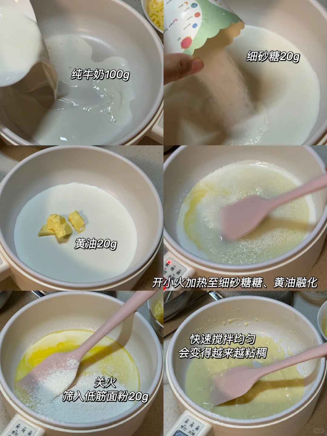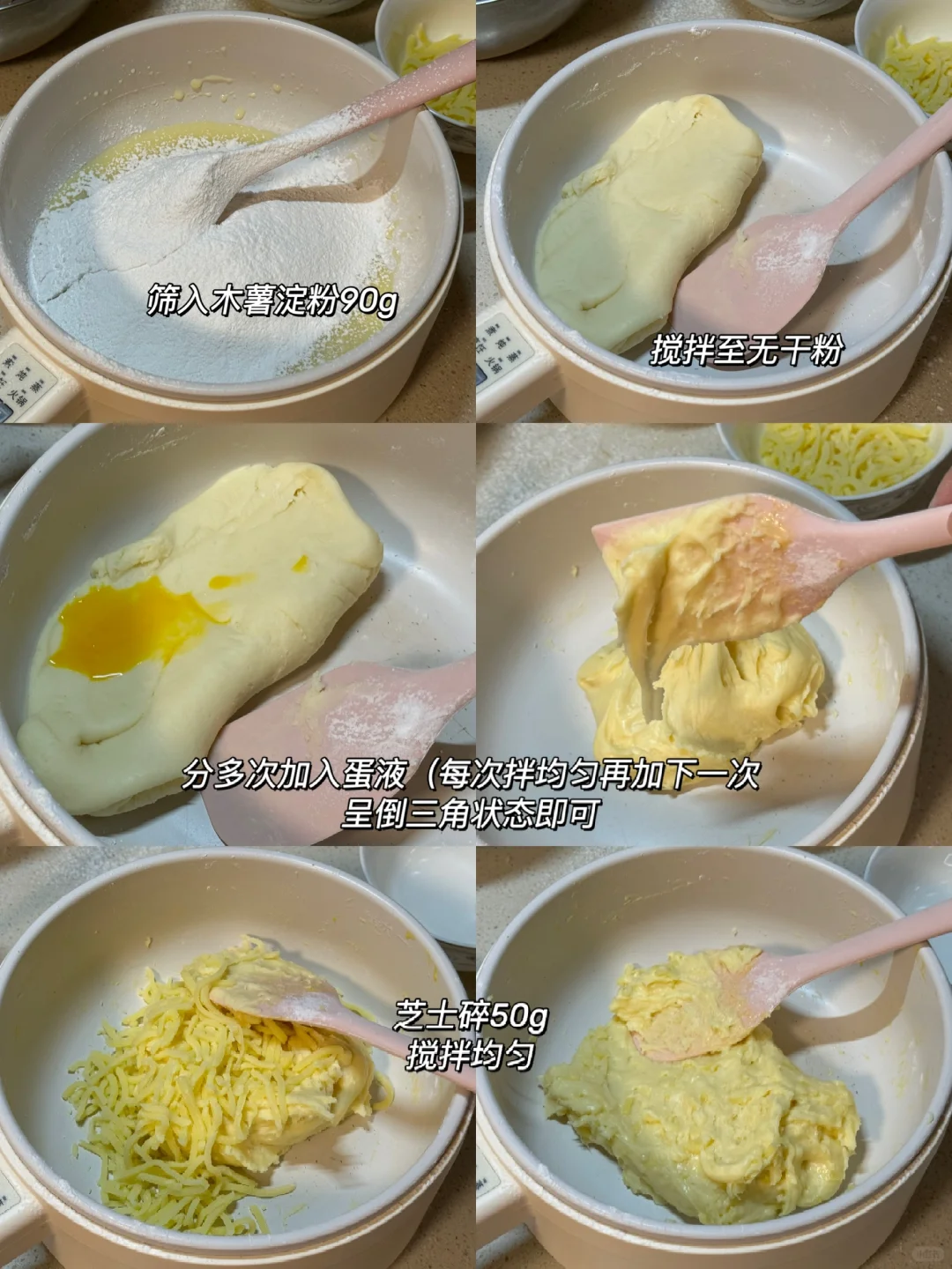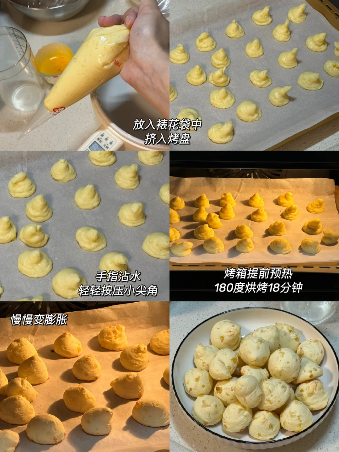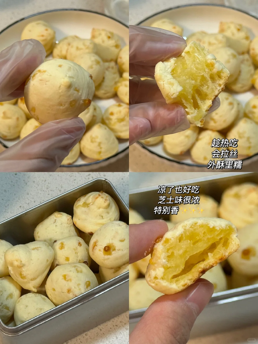 🌷食材:纯牛奶100g,细砂糖20g,黄油20g,低筋面粉20g,木薯淀粉90g,芝士碎50g,鸡蛋液适量。 🌷做法:1.纯牛奶、细砂糖、黄油,开小火加热至融化。 2.关火,筛入低筋面粉,快速搅拌均匀(会变得越来越浓稠)再筛入木薯淀粉,搅拌至无干粉。 3.分多次加入鸡蛋液,呈倒三角状态,加入芝士碎,搅拌均匀。 4.放入裱花袋中,挤入烤盘,手指沾水轻轻按下小尖角,烤箱提前预热,180度烘烤18分钟。 🌷慢慢变圆,慢慢膨胀,趁热吃会拉丝,凉了吃也很好吃,芝士味浓郁,超级香[赞R][赞R][赞R]
