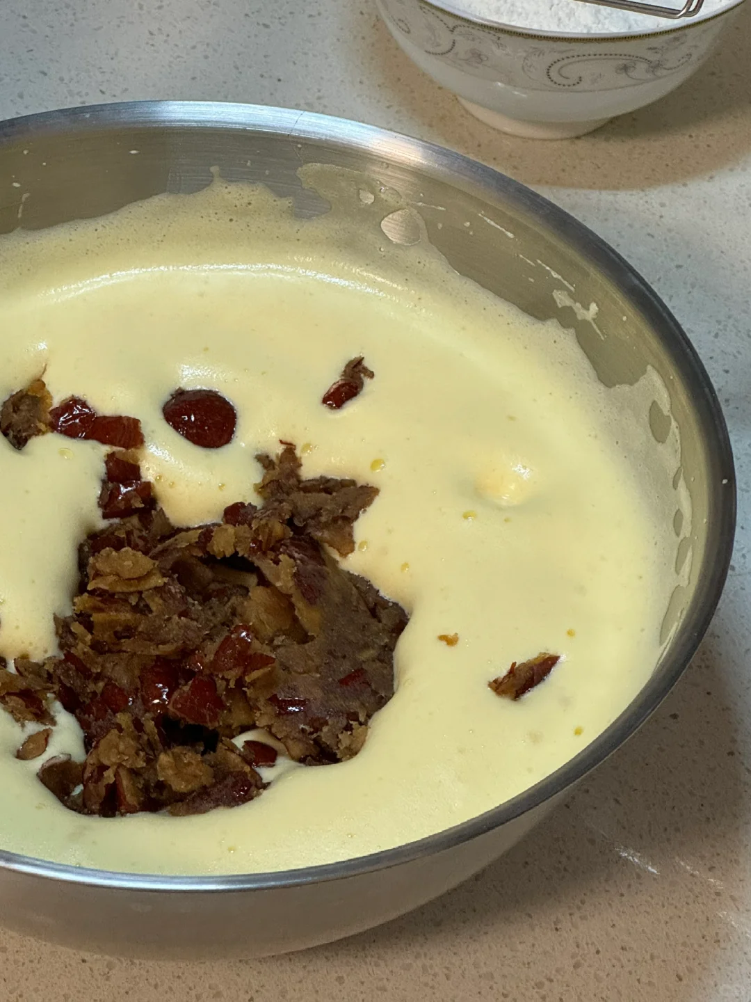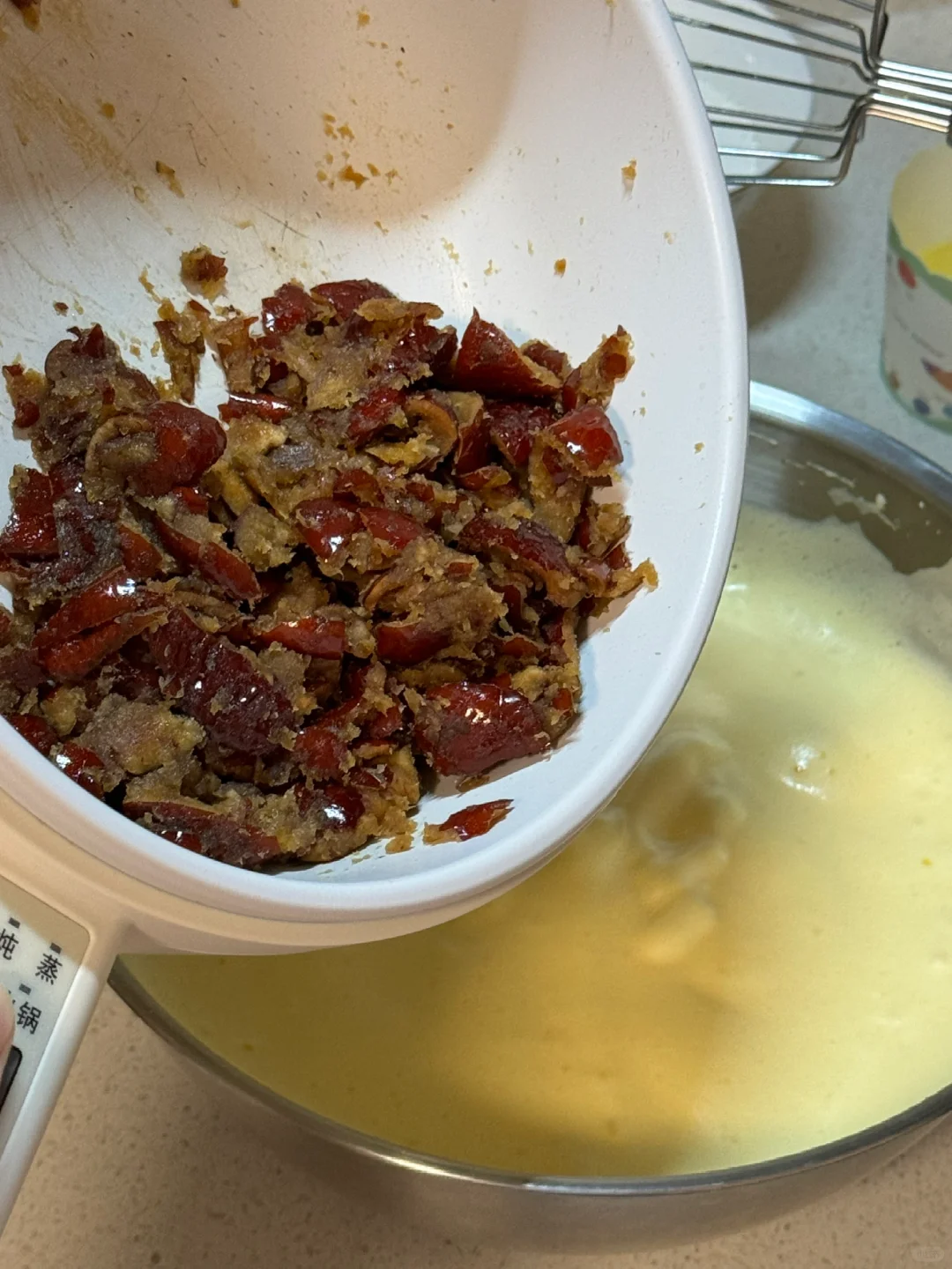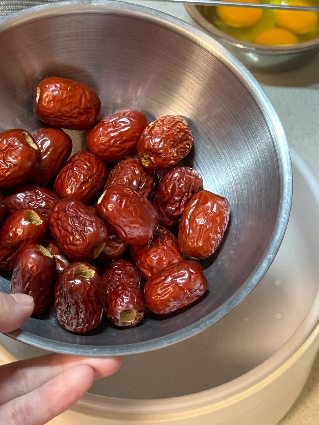 🌷食材:去核红枣100g,纯净水80g,全蛋液(常温)150g,细砂糖40g,玉米油40g,低筋面粉90g,泡打粉1g