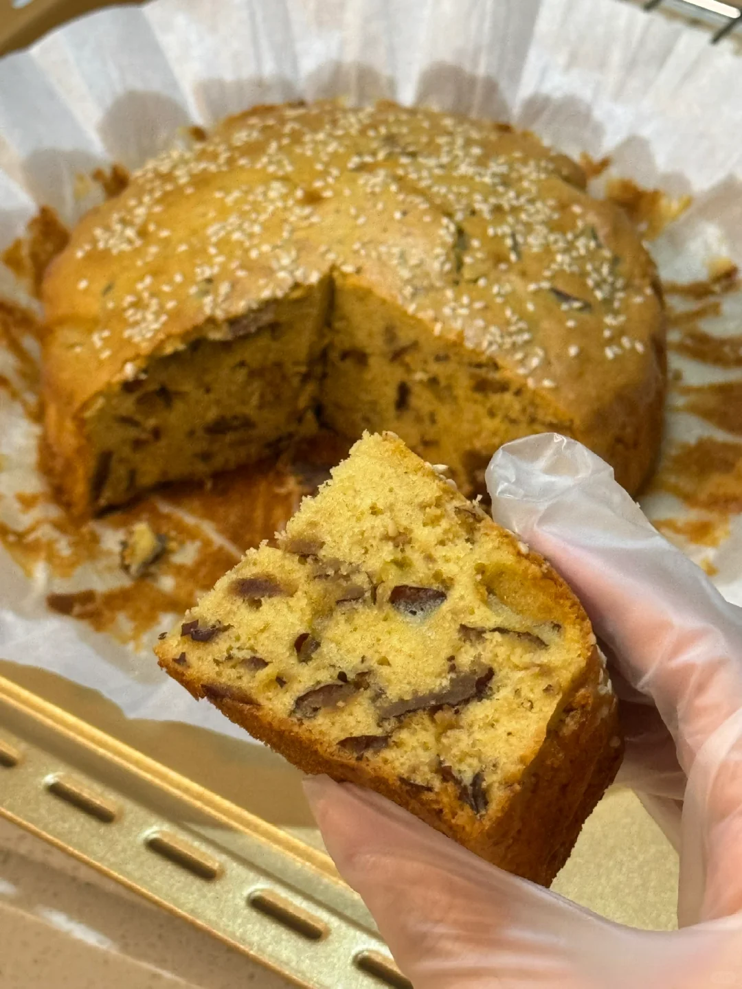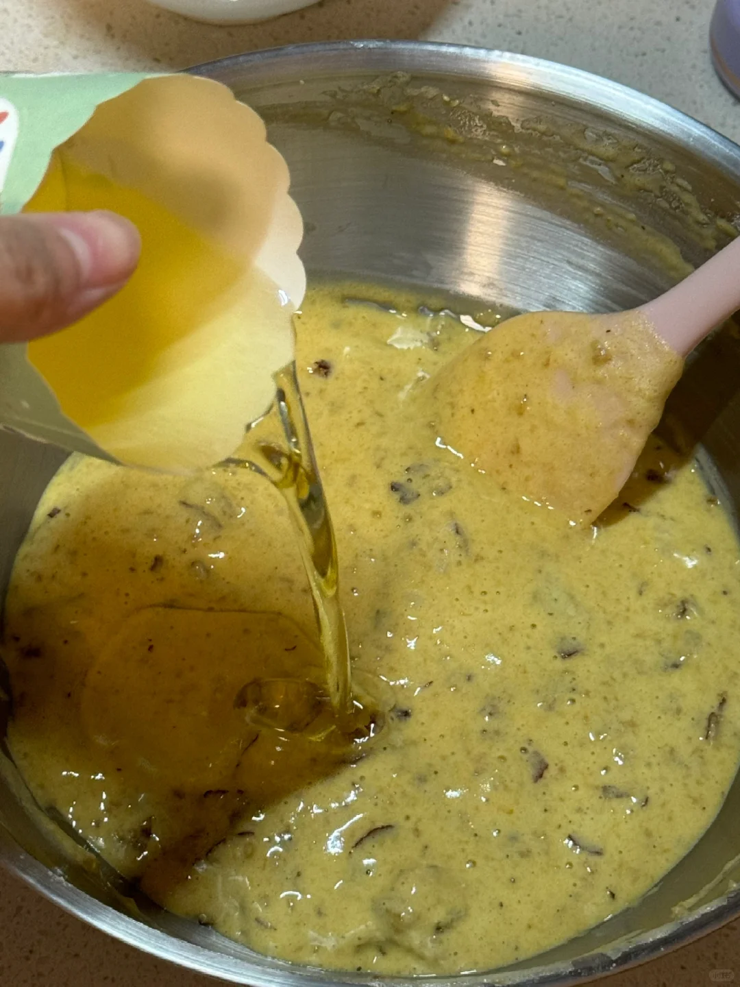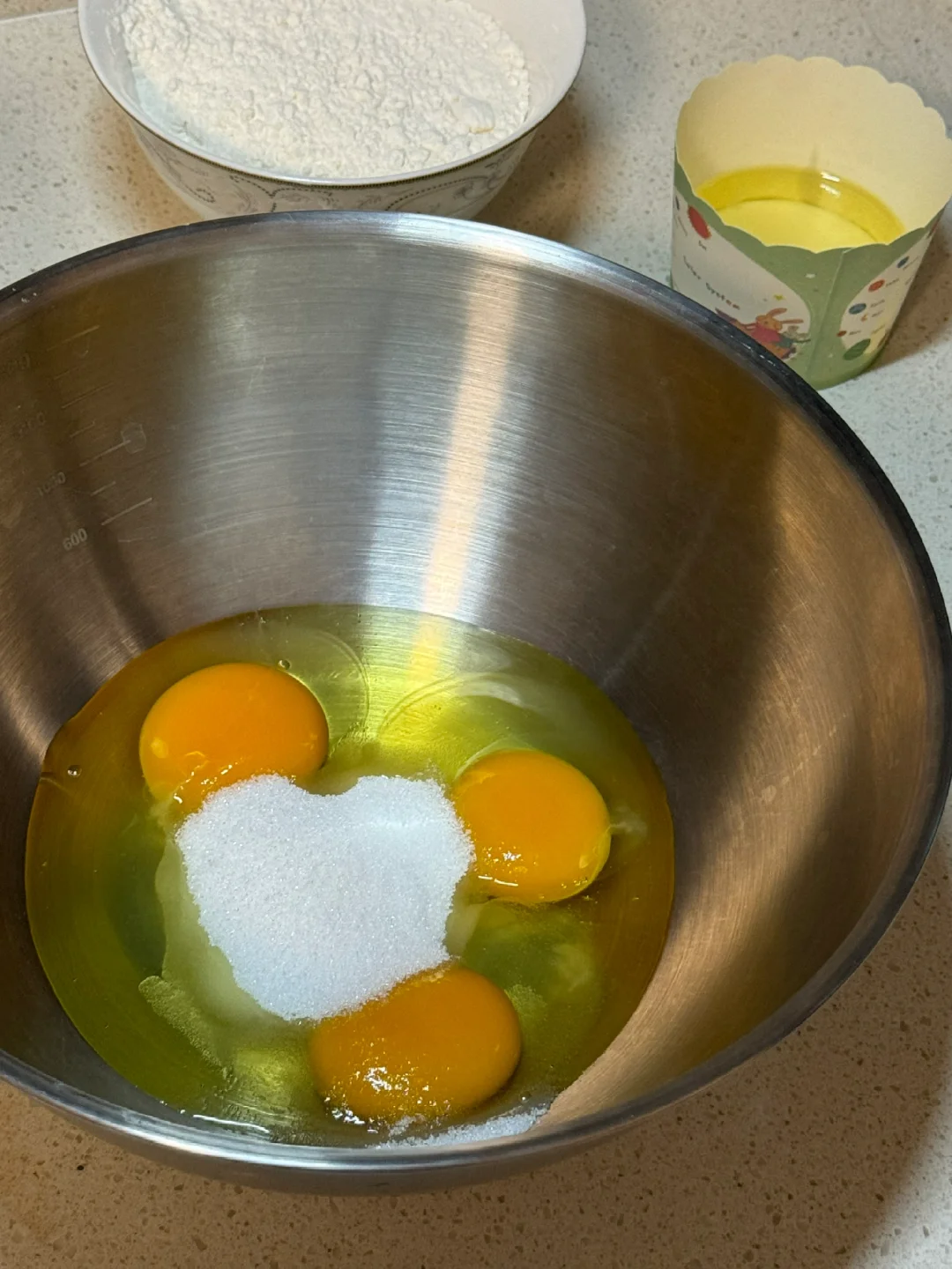 🌷食材:去核红枣100g,纯净水80g,全蛋液(常温)150g,细砂糖40g,玉米油40g,低筋面粉90g,泡打粉1g