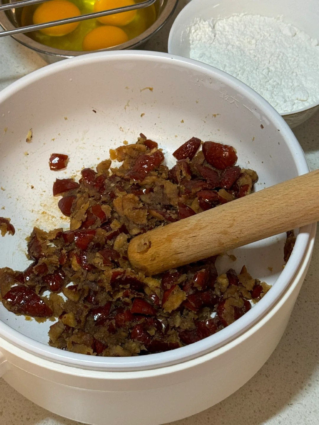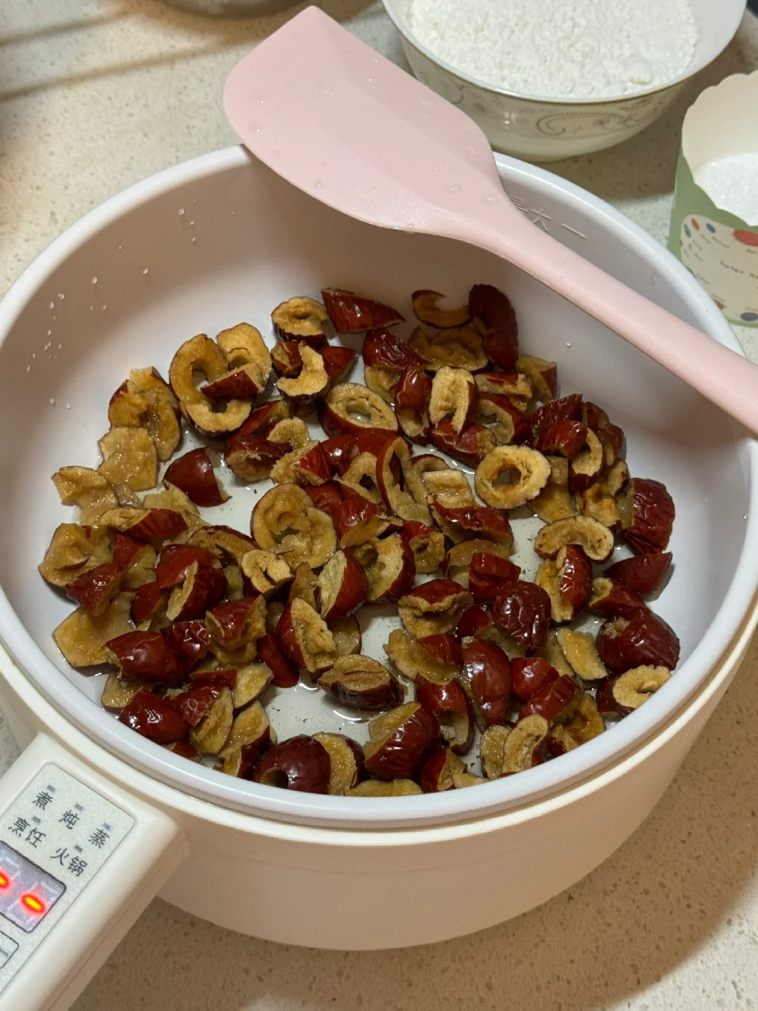 🌷做法:1.红枣切成小丁加入水小火煮至软烂,捣成枣泥备用。