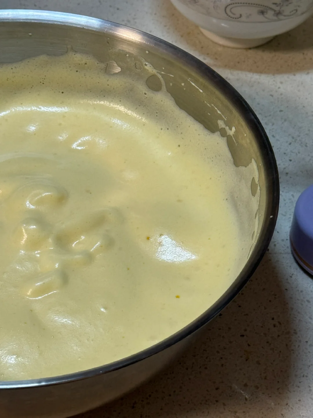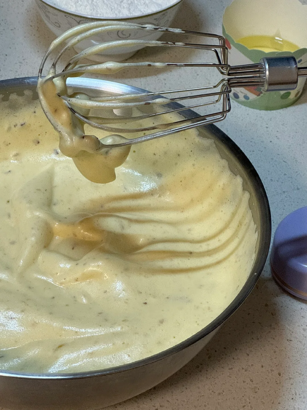 2.鸡蛋打入大碗中,加入细砂糖,中高速打发12分钟左右,再转低速打发至细腻,打发至划8字不易消失,加入枣泥继续打发混合均匀,筛入低筋面粉翻拌均匀,最后加入玉米油翻拌均匀。
