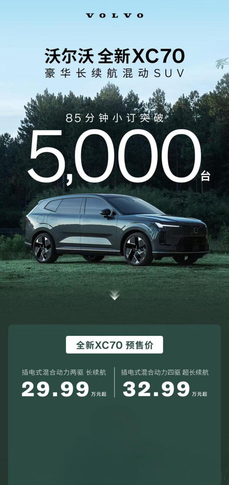在8月27日,沃尔沃全新XC70在国内完成了全球首发并发布了预售价,85分钟后,沃尔沃官方就迫不及待的公布了小订破5000的成绩。