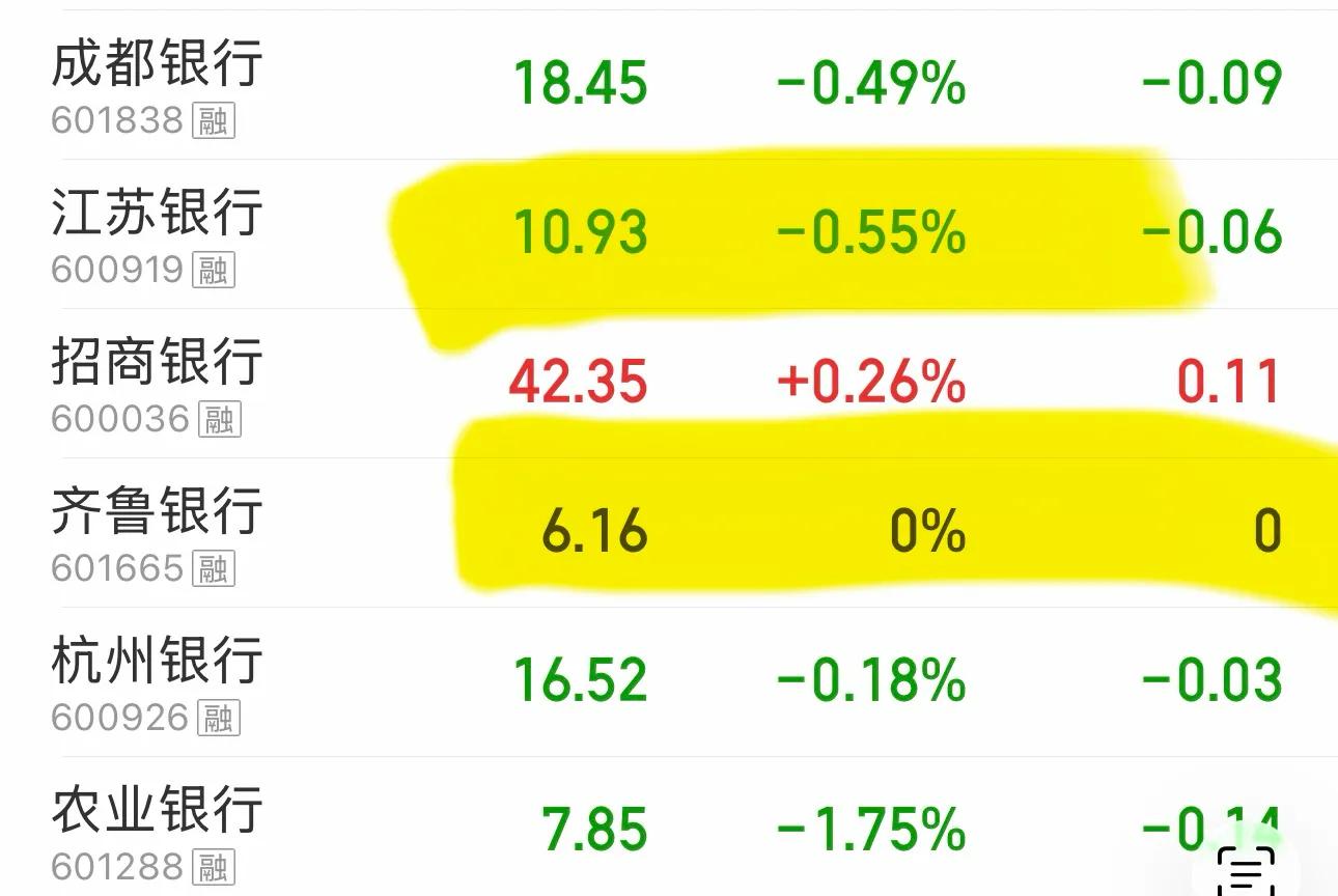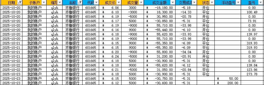 这第二张图,是我在齐鲁银行本周的做T情况。到昨天为止,我在齐鲁银行上完成八个T,收益1491元。但是这不是重点,重点是最后两笔记录,我昨天在6.12元和6.15元,分别买入了5000股齐鲁银行。这一万股齐鲁银行,耗资6.1万,和我10.99元的江苏银行形成一个双T。因为江苏银行卖出了5.5万,所以,综合看我的银行股持仓,昨天其实我是净流入6000元到银行股的。虽然我少了5000股江苏银行,但是我多了10000股齐鲁银行。