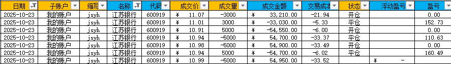最后有一个10.99元的卖出,因为10.99元也是昨天的收盘价,所以没有平仓。也就是,这是一个反T的开仓,并且当日没有平仓。因为这个卖出,我昨天收盘时的江苏银行持仓为19.5万股,比我的底仓20万股少了这5000股。
