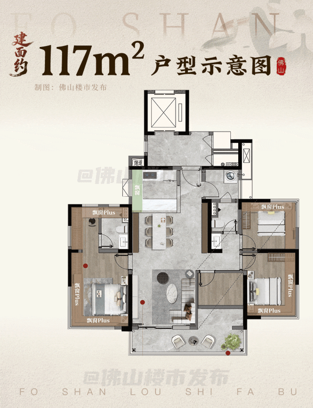 建面约117平四房为2梯3户的单边位设计,相当于独梯独户,LDKB一体化大方厅,加上约3.1米的层高,空间感更显阔绰。