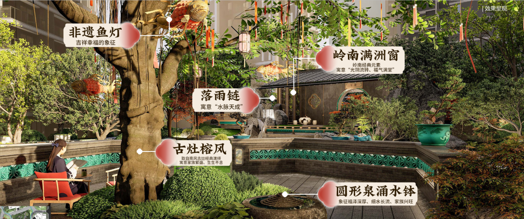 梁园同款的个轩、满洲窗、锦鲤戏水……每一处场景都复刻岭南文化精髓;同时,定制化的悦字系纹样、鱼嘴纹等,构成了独属于项目的情感语言。