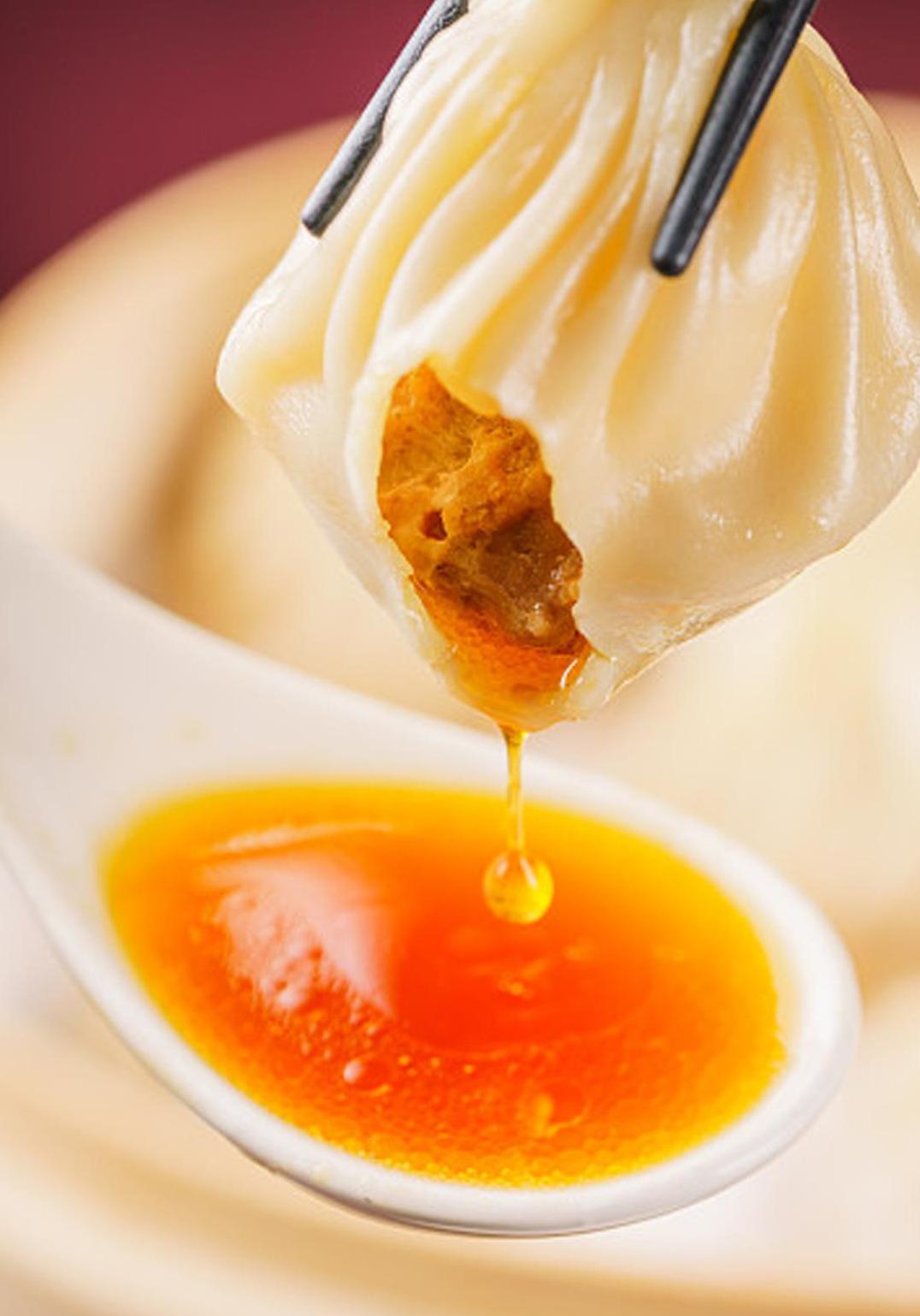 手工拆出的蟹肉黄与猪肉肉冻混合,每一粒汤包都表皮薄如蝉翼,蒸出来后,馅料如水球般在皮内晃动。