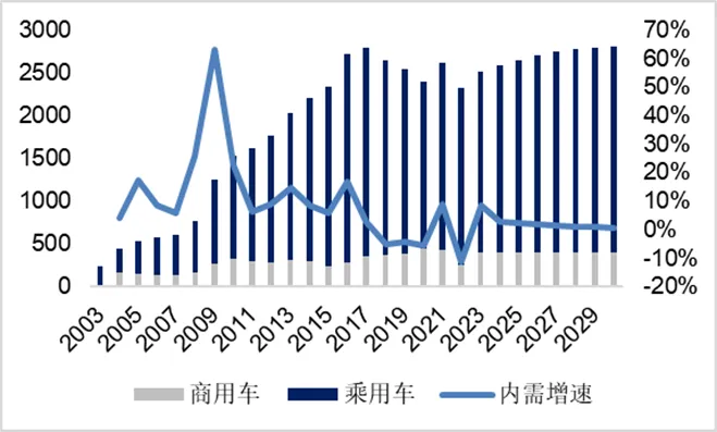 总的来说,我国汽车国内市场已经从高增长进入到中低增长阶段,预计2030年,内需口径下国内汽车销量2800万辆左右,保持着1.6%左右的潜在增速,汽车保有量将达到4.3亿辆,千人汽车保有量约300辆。