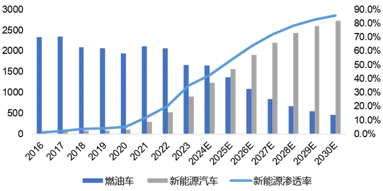 2030年全球汽车销量结构将实现油电平衡。预计全球新能源汽车销量达到4000万辆,渗透率接近50%。
