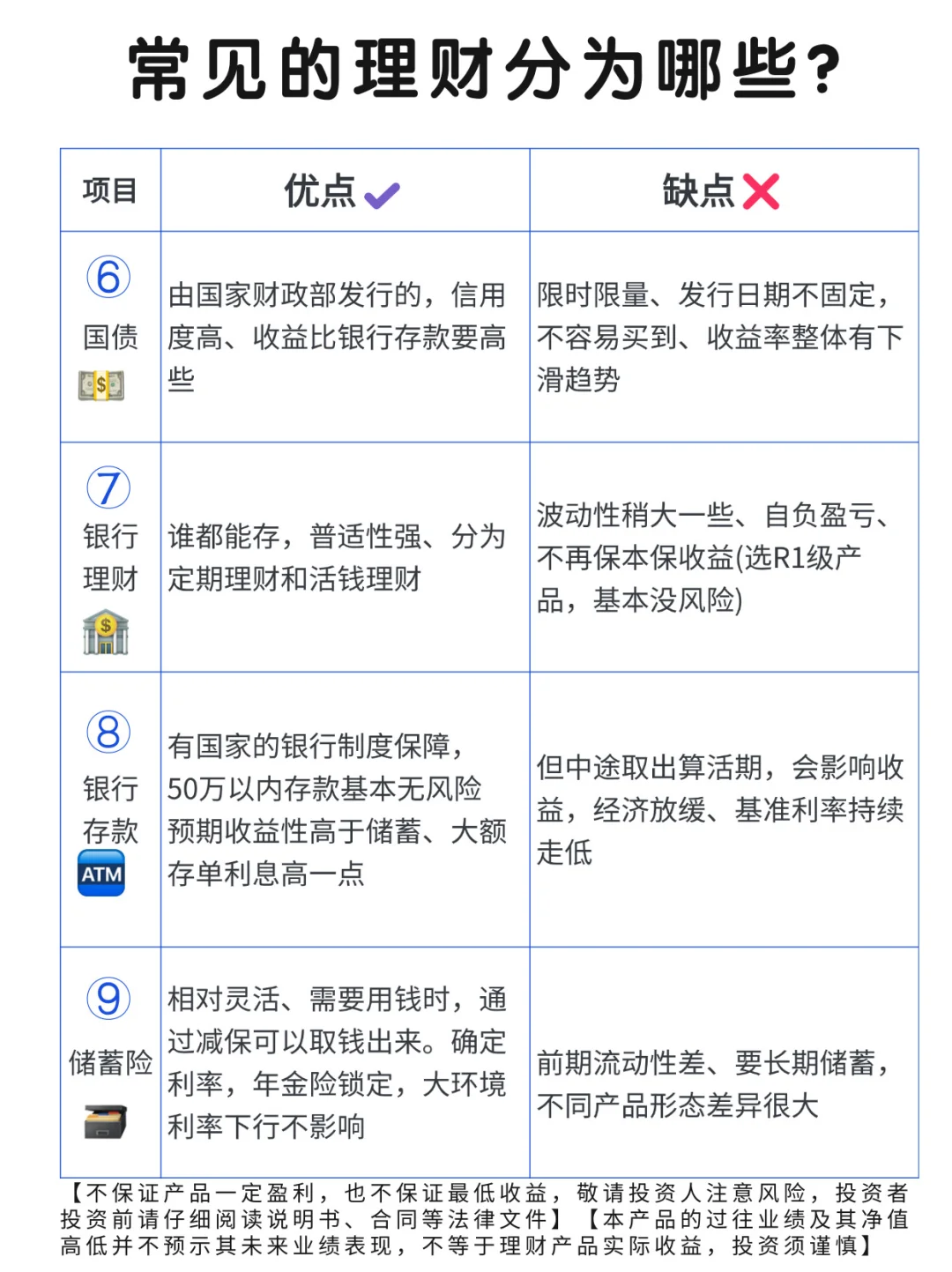 第1️⃣步,了解清楚各类型理财方式,不要盲目跟风,选择合适自己的最重要!详见上图。
