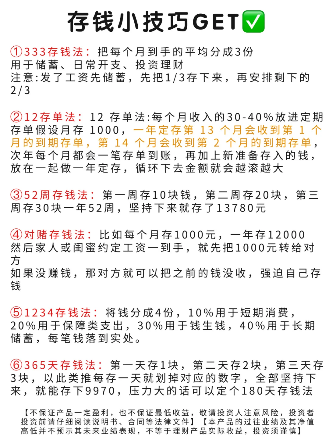 第2️⃣步,存钱,现在很多人都是月光族,有时候可能还不知道钱花哪去了,我建议可以准备一张银行卡,💰每个月发的工资固定往这个卡里存一笔钱,剩下的钱有结余的时候也转到这个卡里。✔️在此之上我还整理了6种具体实用的存钱方法在图4~❤️建议保存!