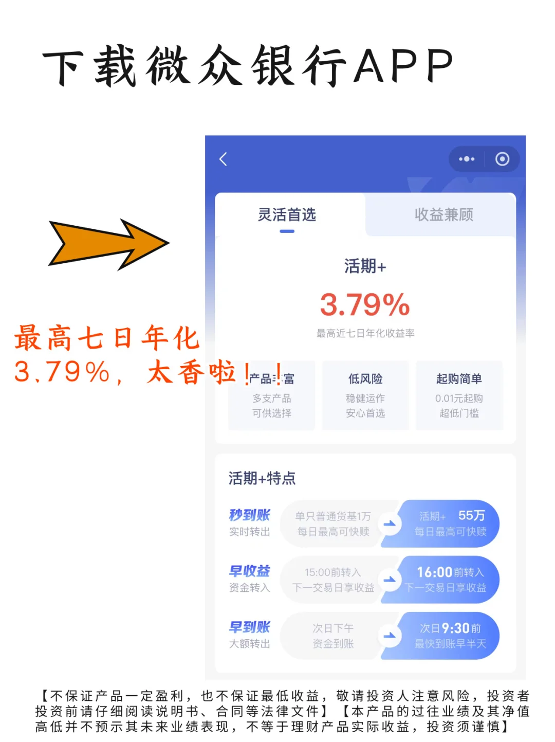 第3️⃣步,以钱生钱。我把钱分成两部分,一部分是随时会用到的钱,要保证3个月的生活开销,➡️一部分是长期用不到的钱,长期的存款产品有三年、五年的定期存款;➡️随时要用的钱也要打理,👌可以选择一些活钱理财产品,考虑到了收益率,我日常用的是微众银行的活期+~
