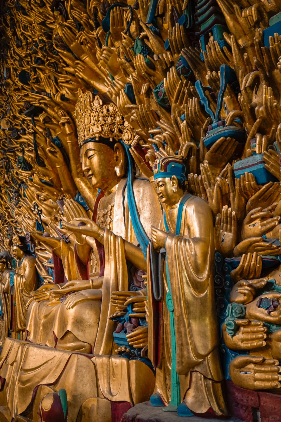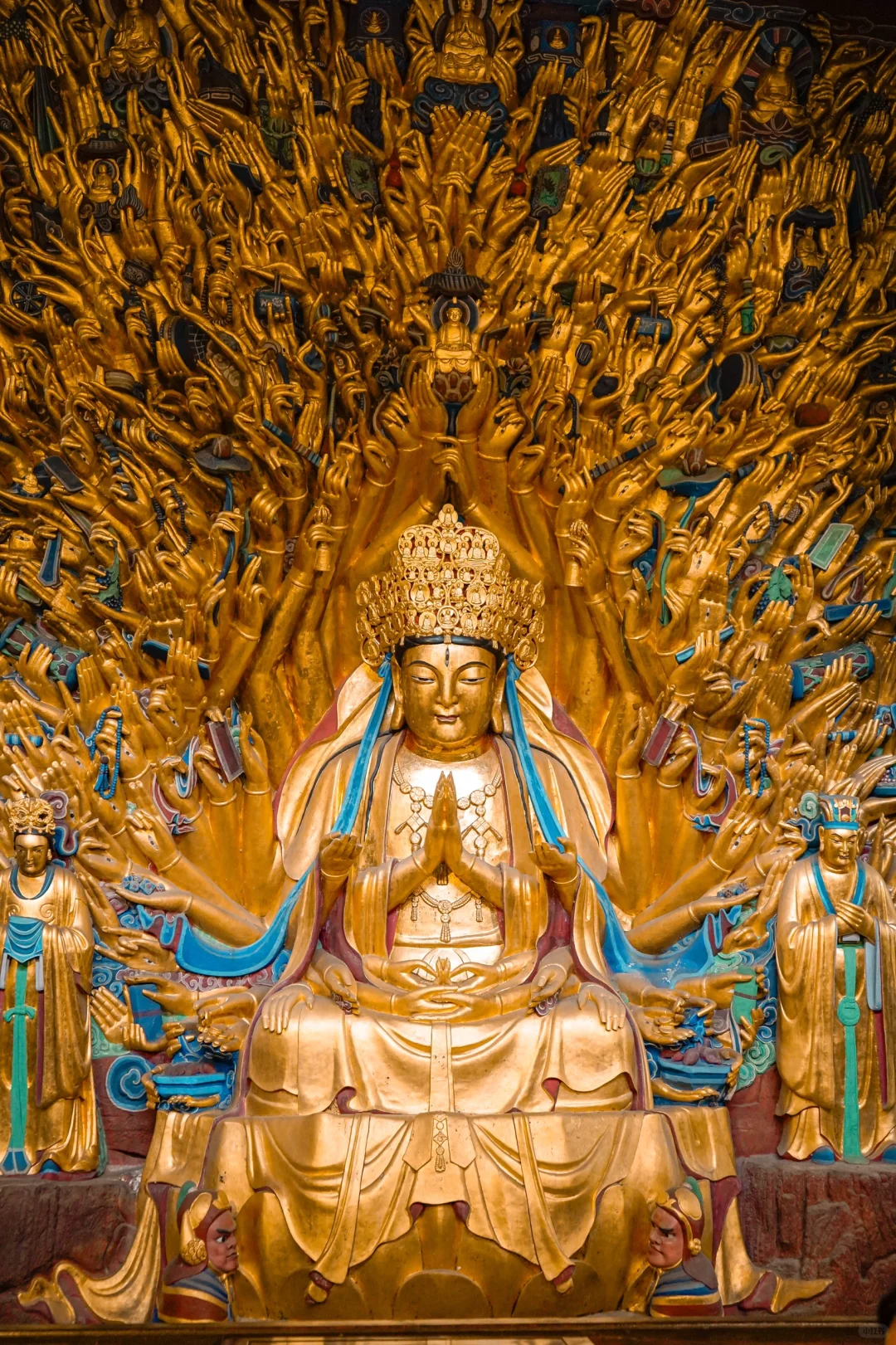 看到金光闪闪的千手观音整个人被震撼到了,每只手上拿着不同的发器,如果你先去了博物馆就会看到一个视频讲解修复千手的过程,一共有1074只手,好像是这个数。