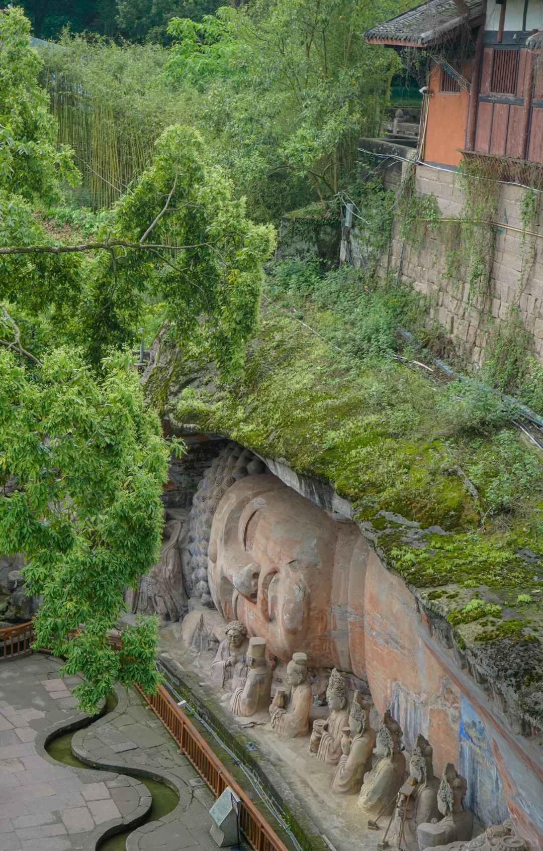 这是宝顶山石刻的「超级C位」,正好位于U形山谷中央,在景区出口处拍卧佛很出片