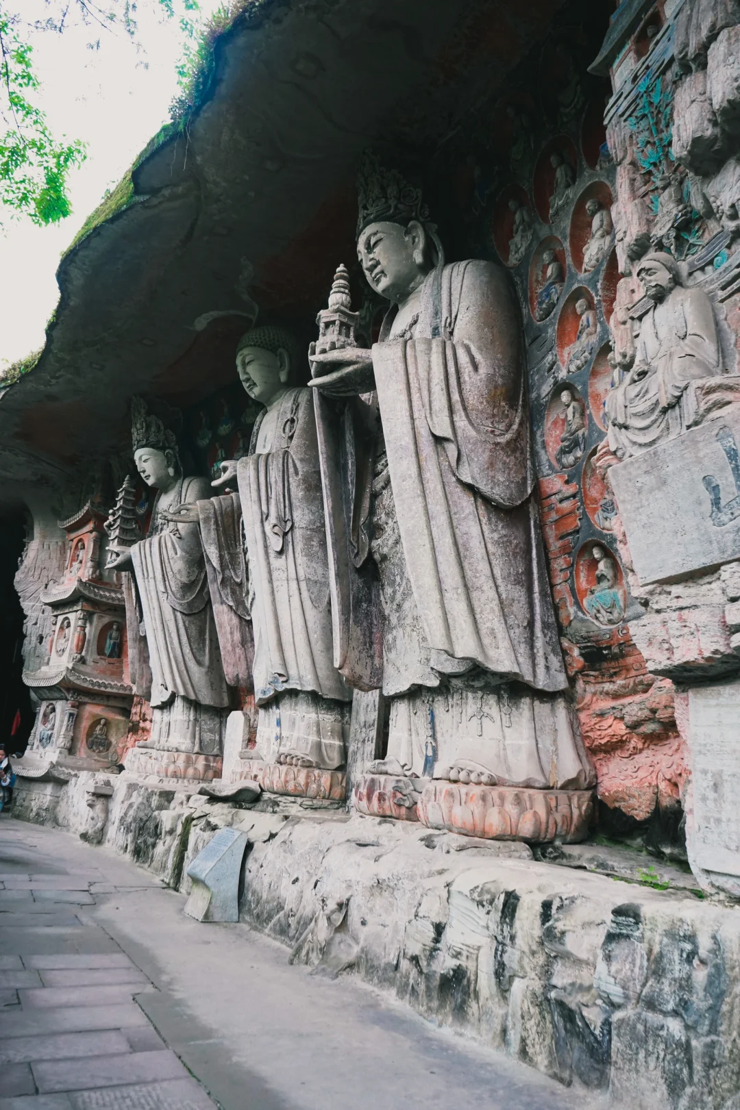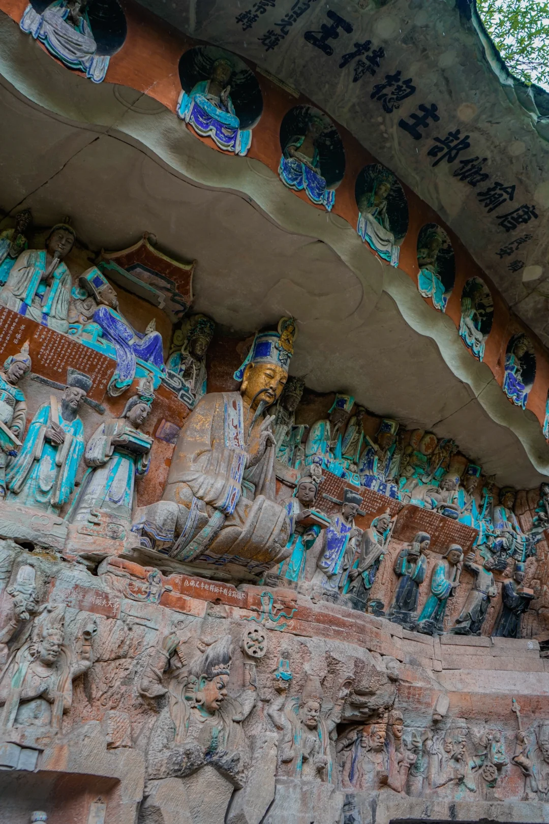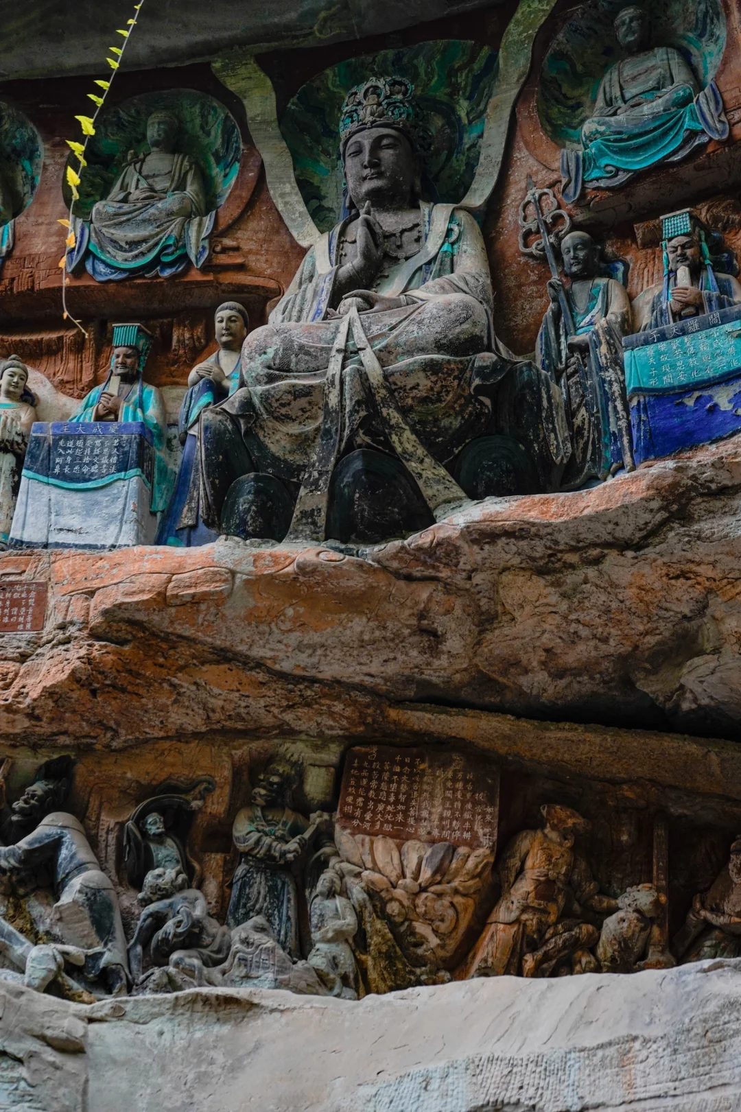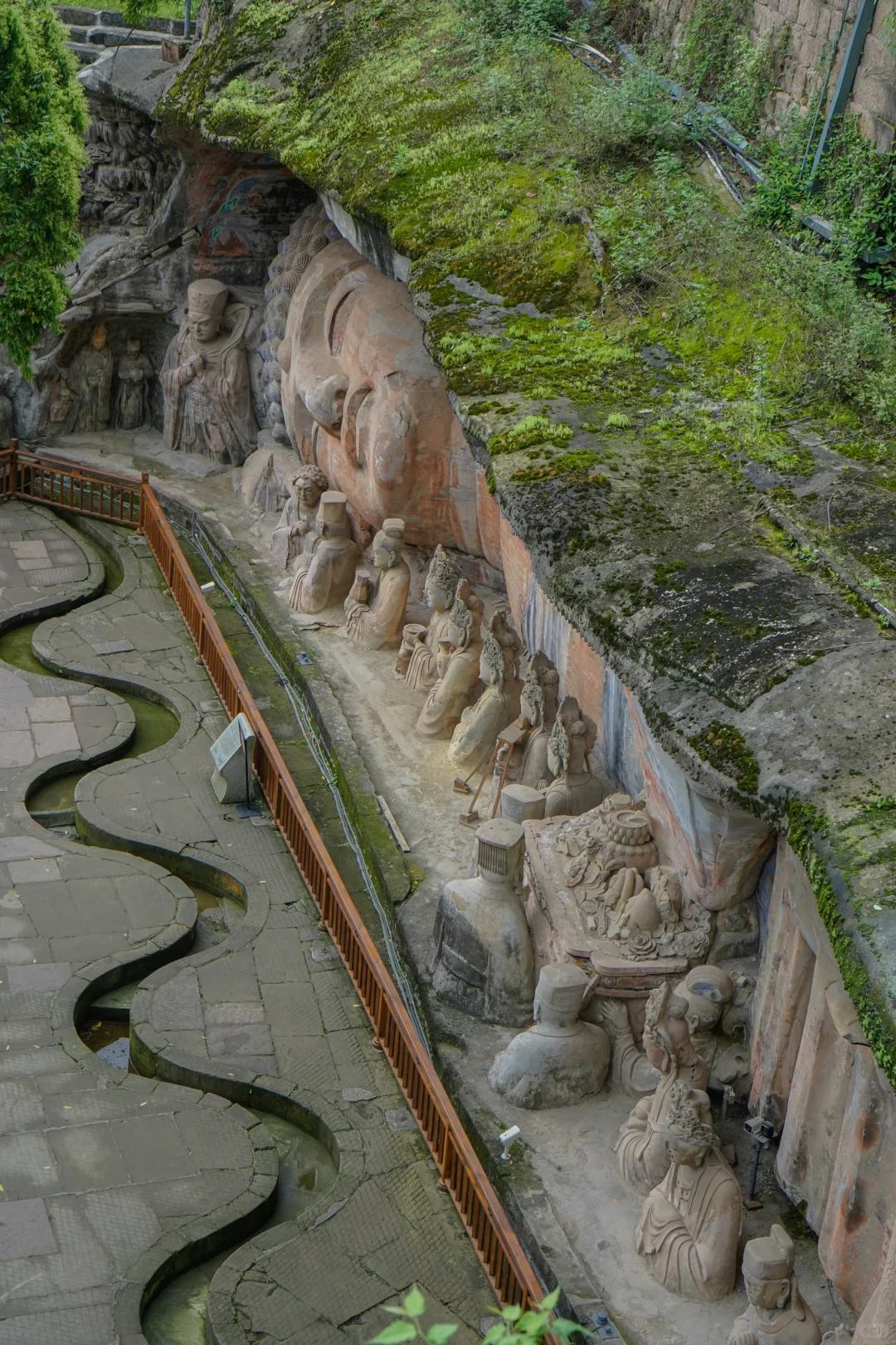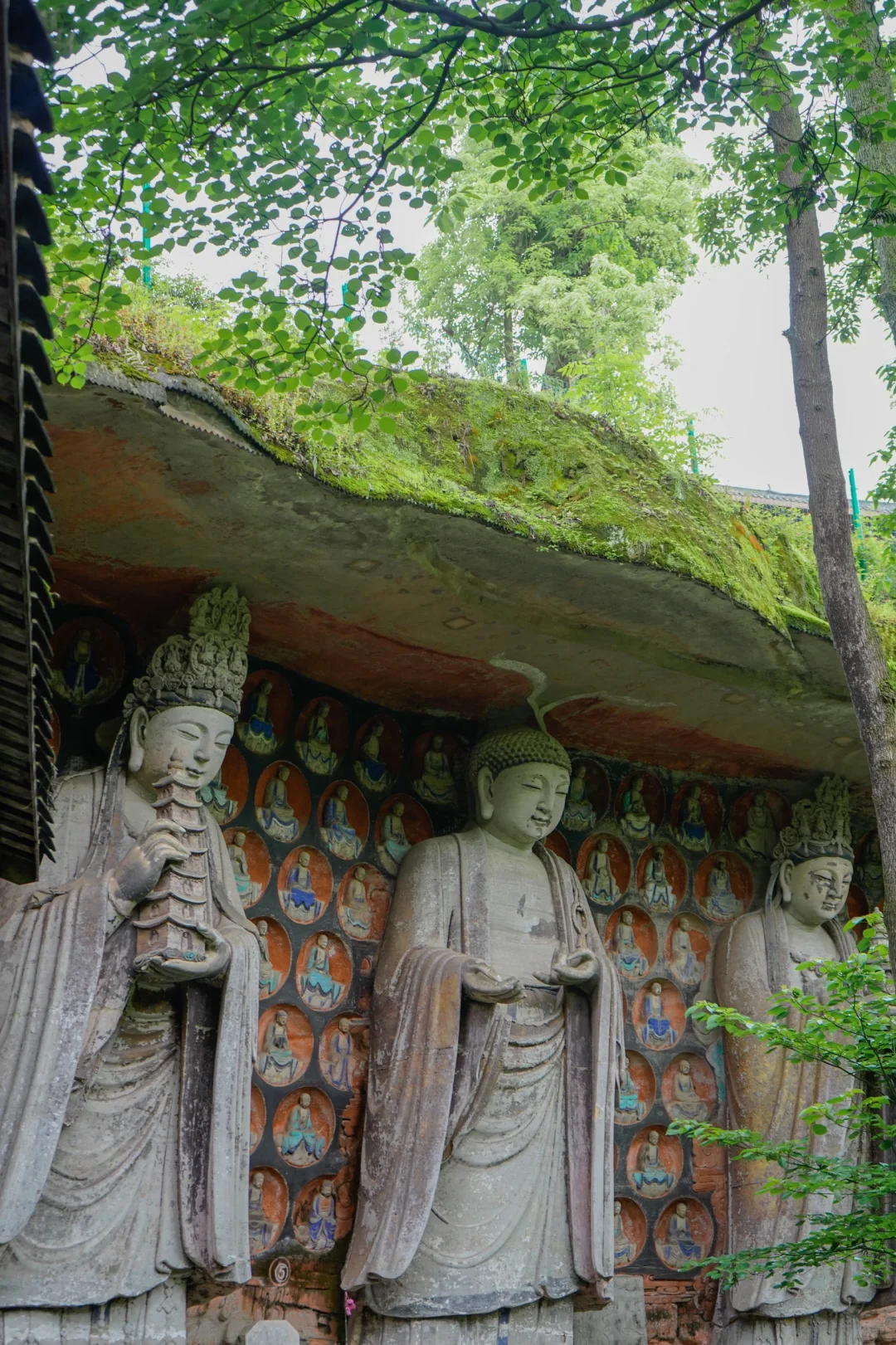 大足石刻开始于初唐、盛于两宋,摩崖雕刻结合了儒释道三者元素,以U字形分布在宝顶山上,摩崖造像大概有500米,真的是叹为观止❗而且宝顶山的风景也格外秀丽。