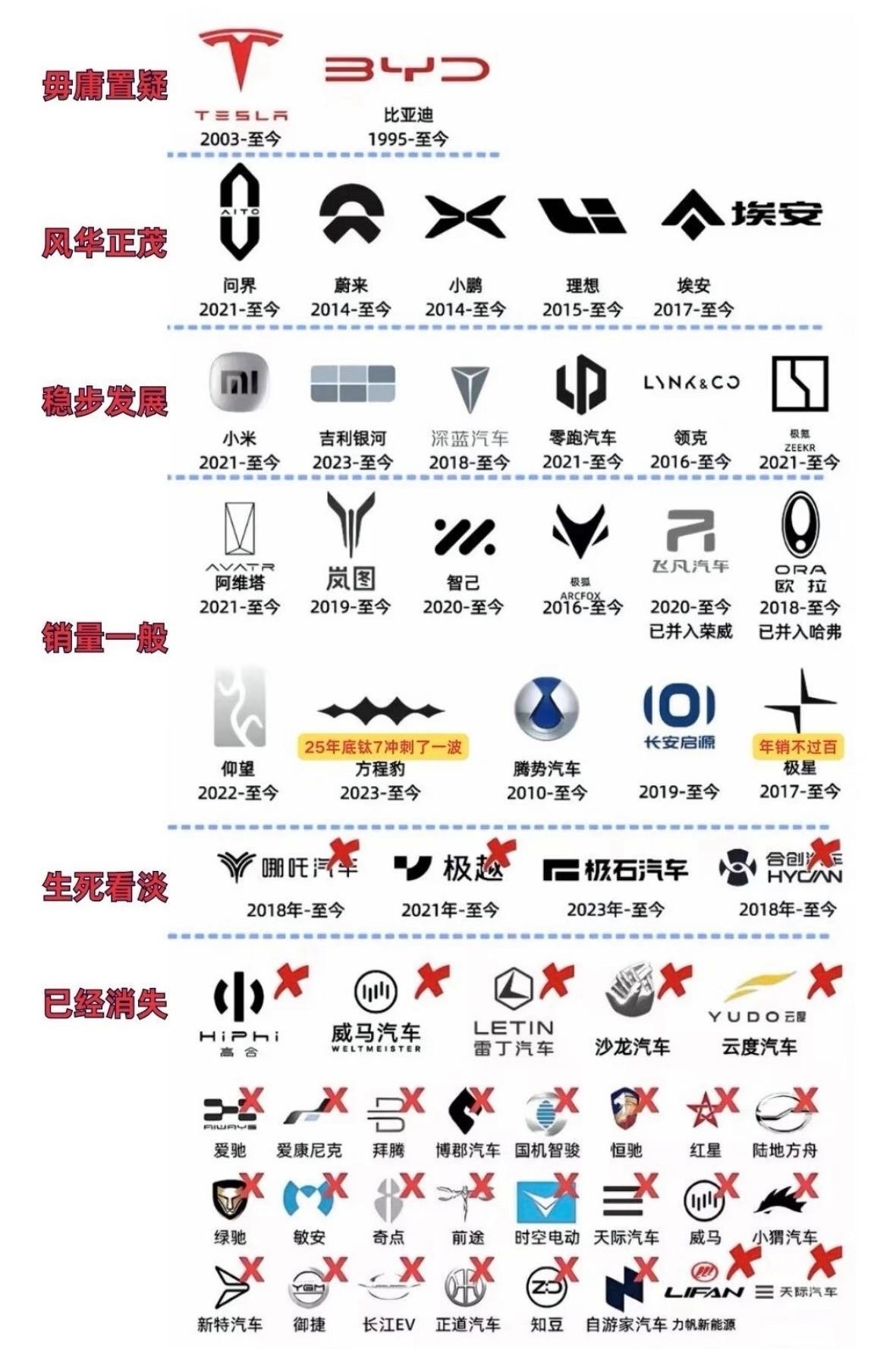 这张图就是当下新能源汽车行业的“众生相”:特斯拉、比亚迪依然稳坐“毋庸置疑”的头部宝座;问界、蔚来等新势力正“风华正茂”,在市场上快速奔跑;而另一边,有的品牌还在“稳步发展”,有的已陷入“销量一般”的困境,更有不少玩家早已“生死看淡”甚至“已经消失”。短短十几年,大浪淘沙,留下的是真金,退场的是过客,每一个车标背后都是一场关于生存与突破的硬仗。