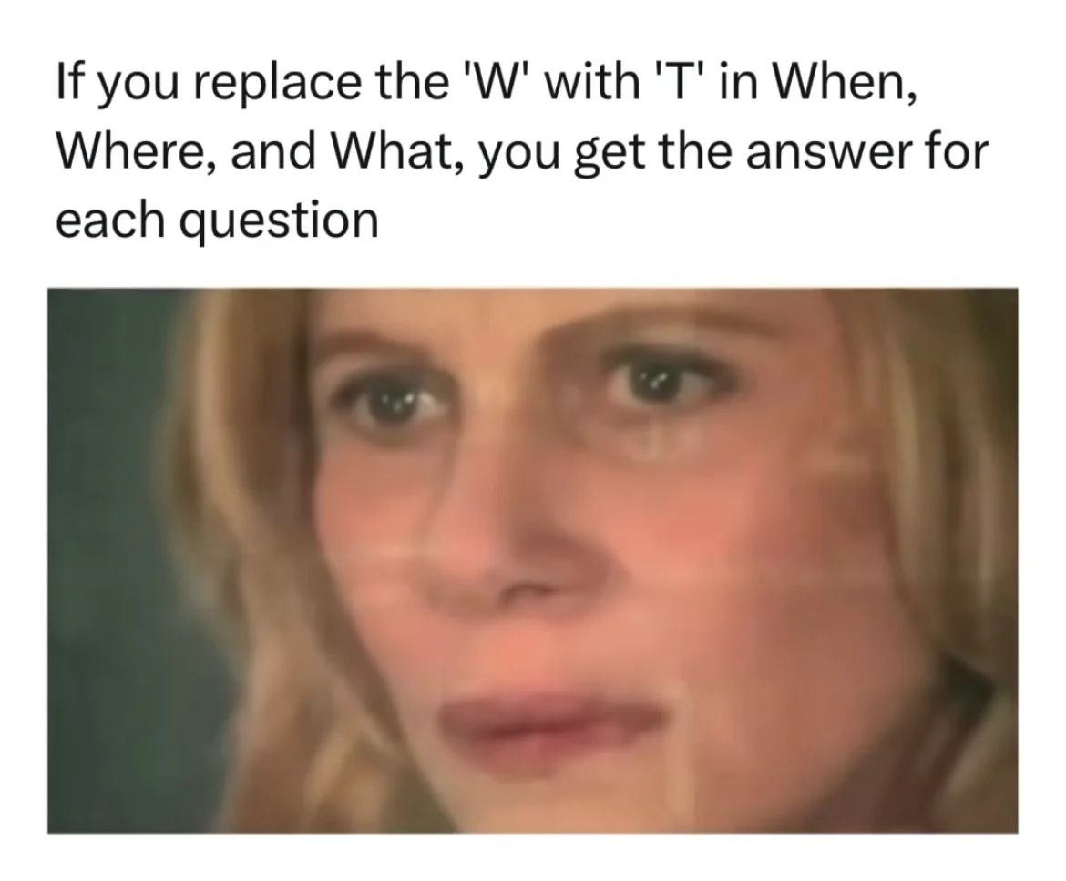 8)把‘when’、’where‘和’what‘中的’w‘替换成’t‘,你将会得到每个问题的答案——