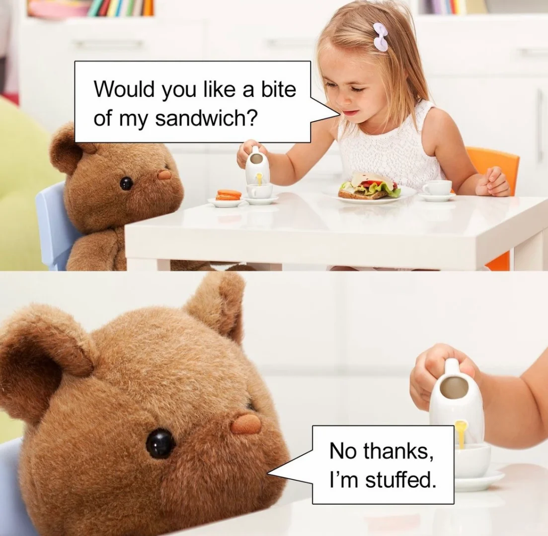 毛绒玩具是用材料填充的(stuffed toy),所以在这里‘I'm stuffed’的双关是‘我是填充的(毛绒玩具)’或是‘我饱了’;