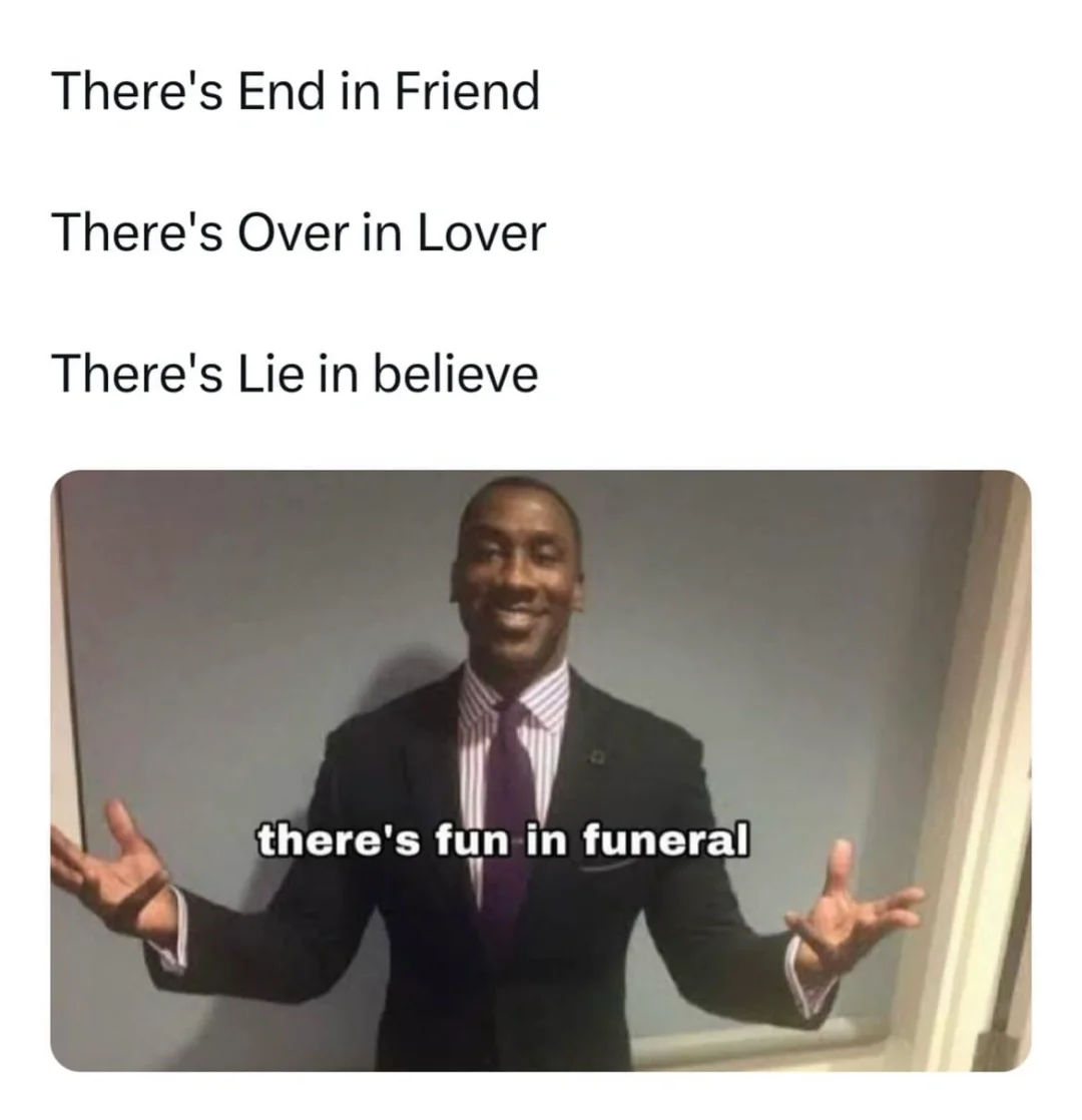 朋友/爱人(关系)会结束,信任中会出现谎言,葬礼中也会有些乐子;