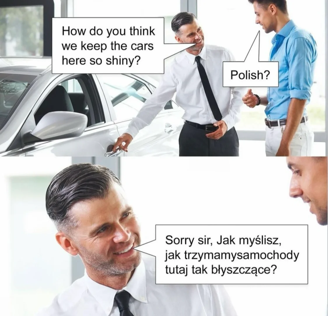 polish还有一个意思,指“波兰语”(但两者发音有点区别),这个销售听岔了,因此用了波兰语再问了这个顾客一遍同样的问题;