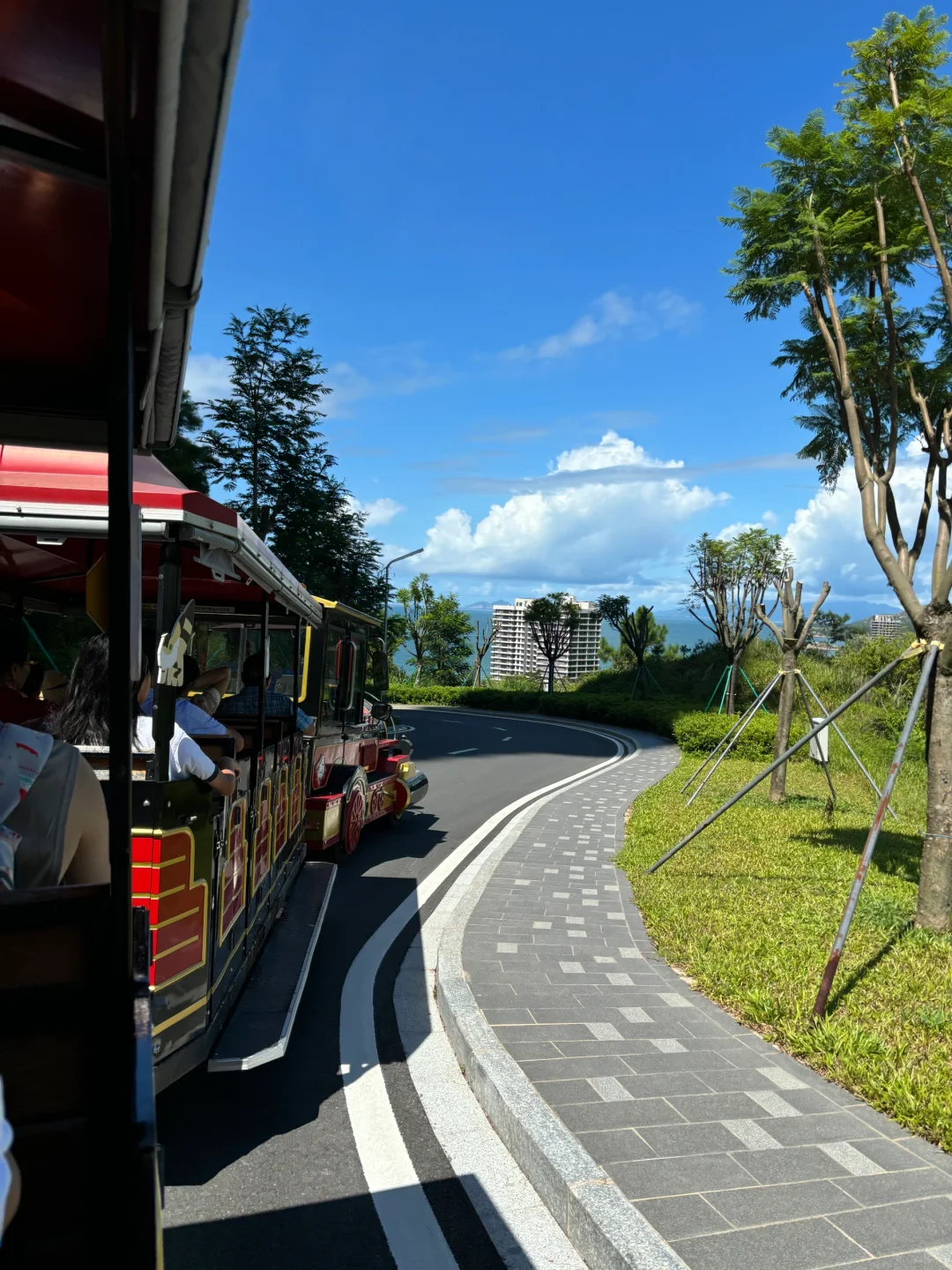 双月湾海滩边,乘坐观光车抵达山底直搭沙滩,沙子细软,有一些装置,傍晚这里应该会很好看,有专门洗脚的地方