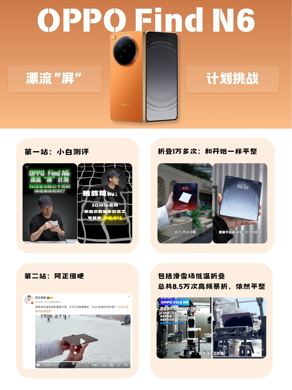 阿正很硬的测试更加硬核,进行了包括滑雪场低温折叠在内的总共8.5万次高频暴折,依然平整,而且低温折叠之后手机一切如常,铰链开合依然顺滑,证明OPPO Find N6的可靠性也是很足的。