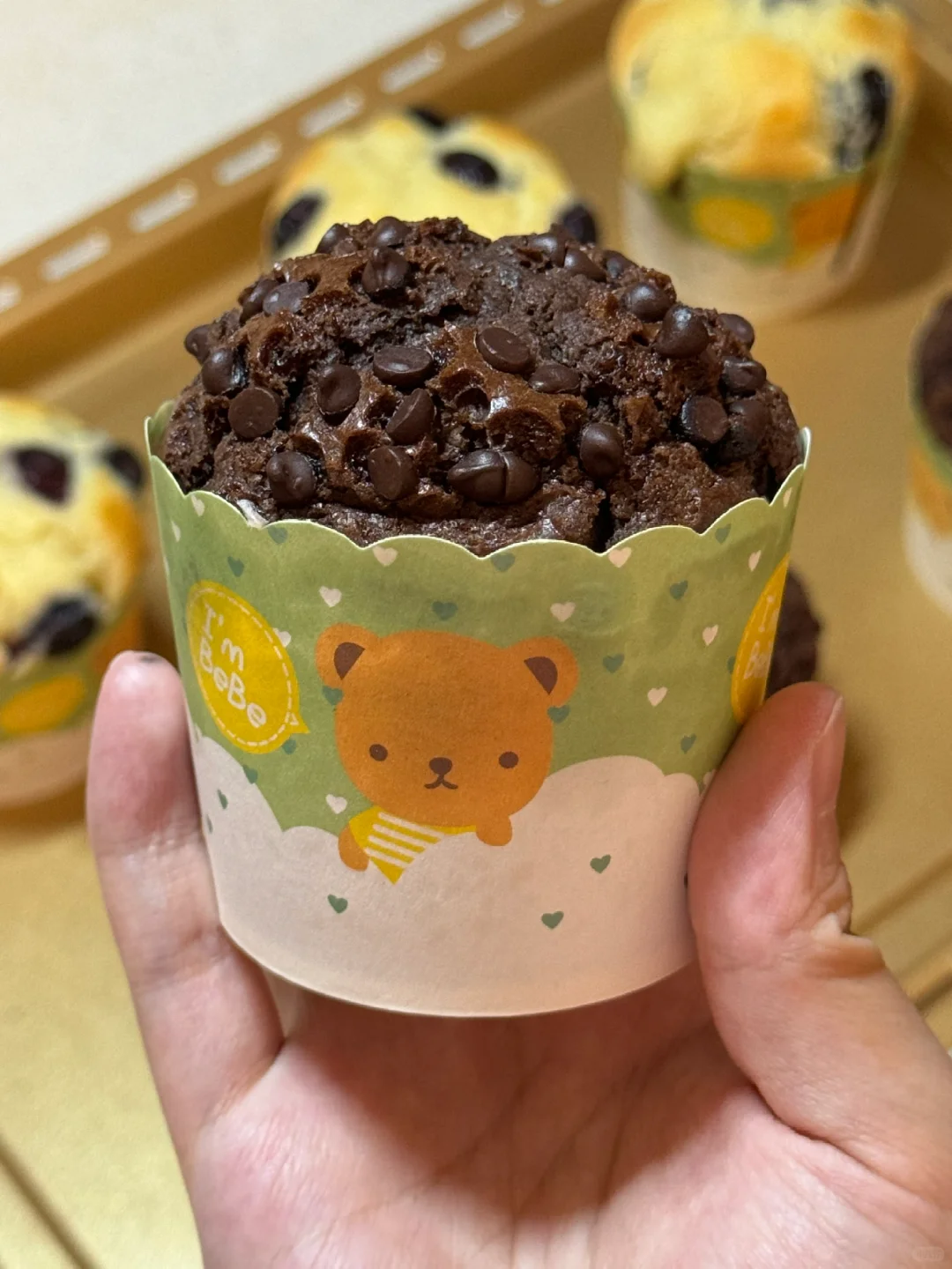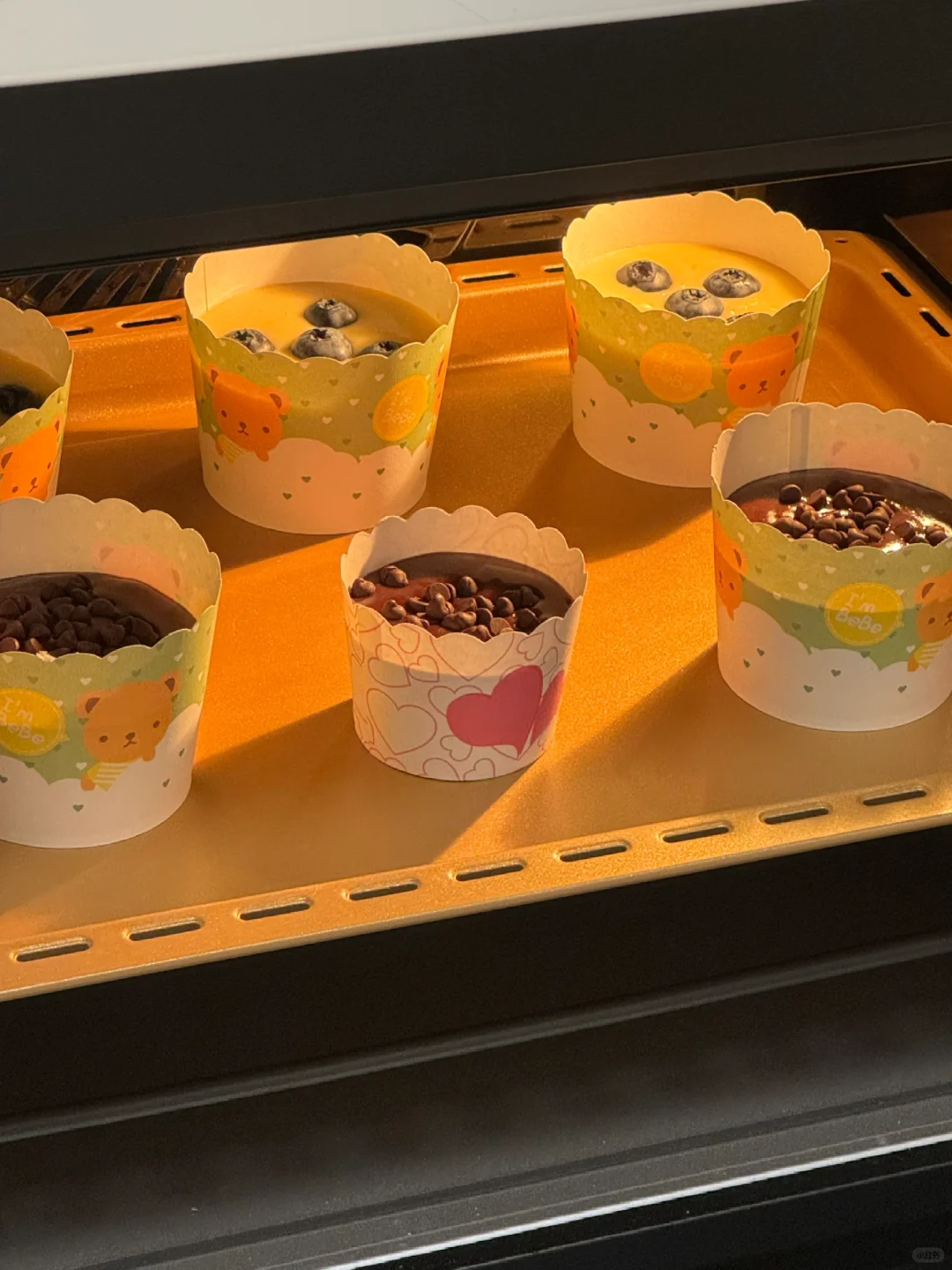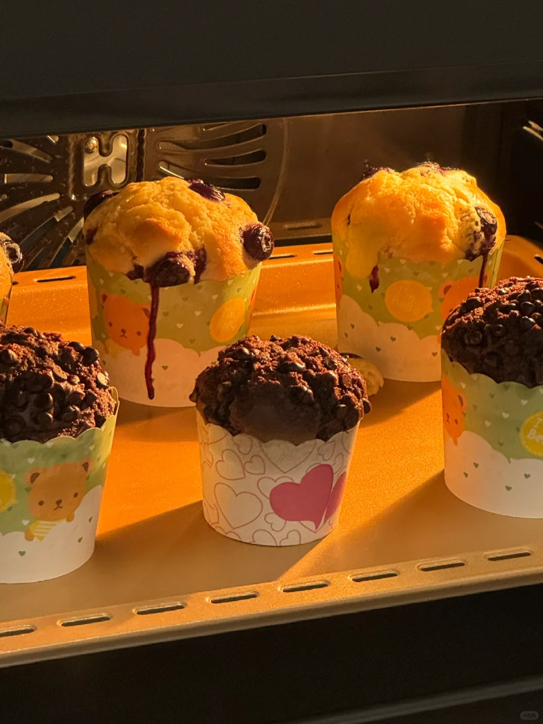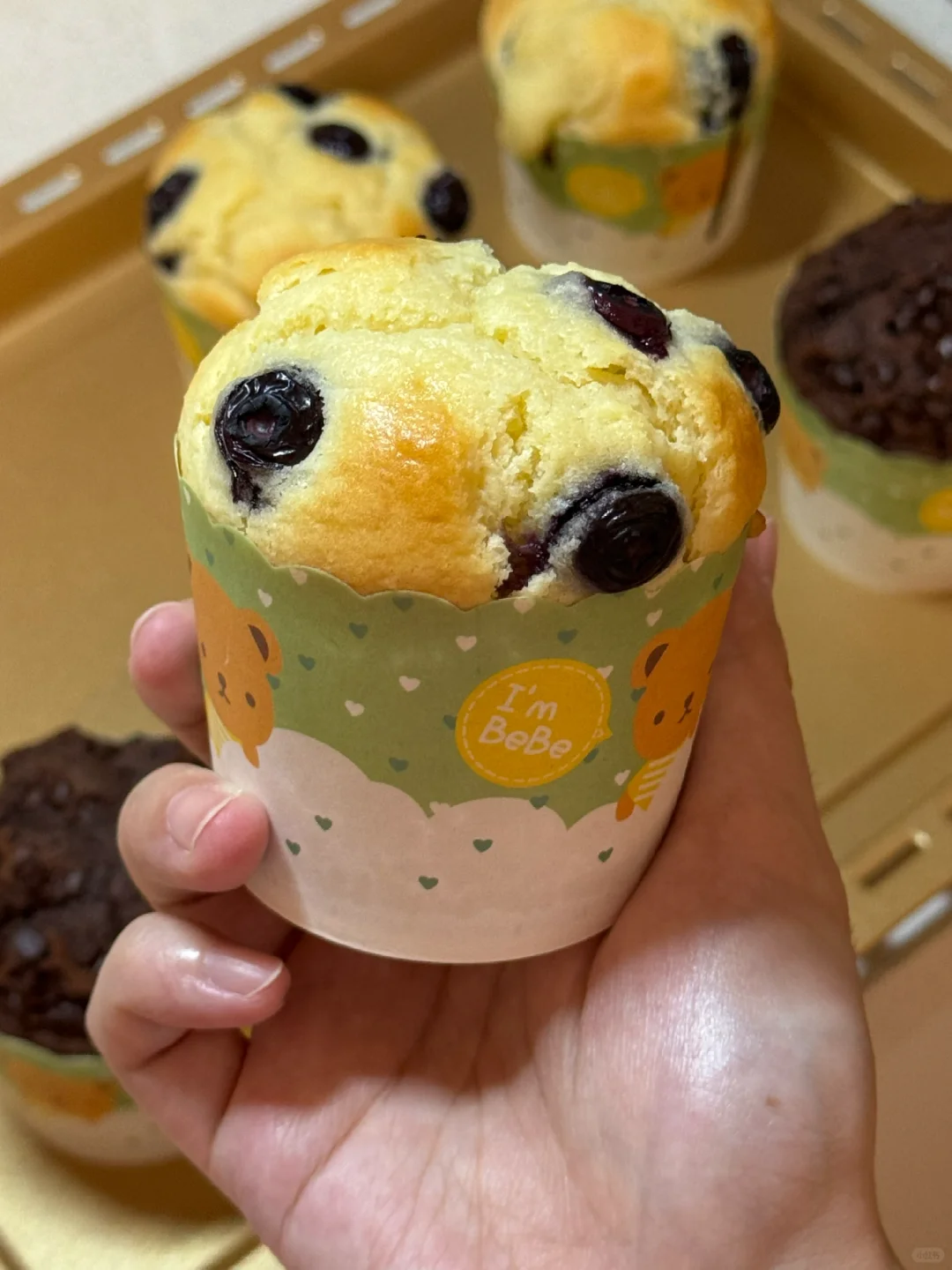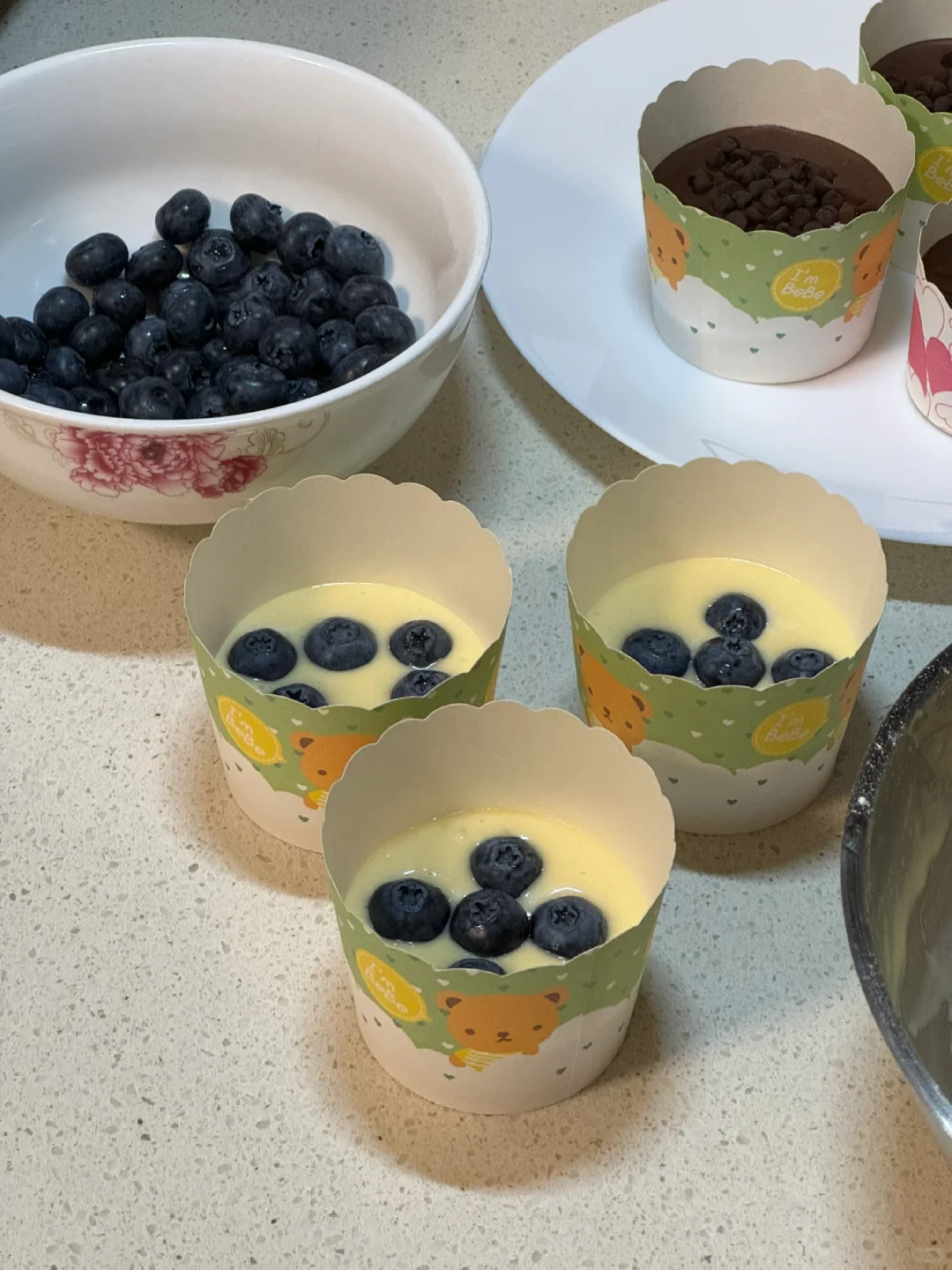 🌷食材:牛奶70g,鸡蛋1个,玉米油45g,低筋面粉100g,可可粉10g,泡打粉5g,细砂糖45g(蓝莓味的把可可粉换成等量奶粉就可以)耐高温巧克力豆,蓝莓。