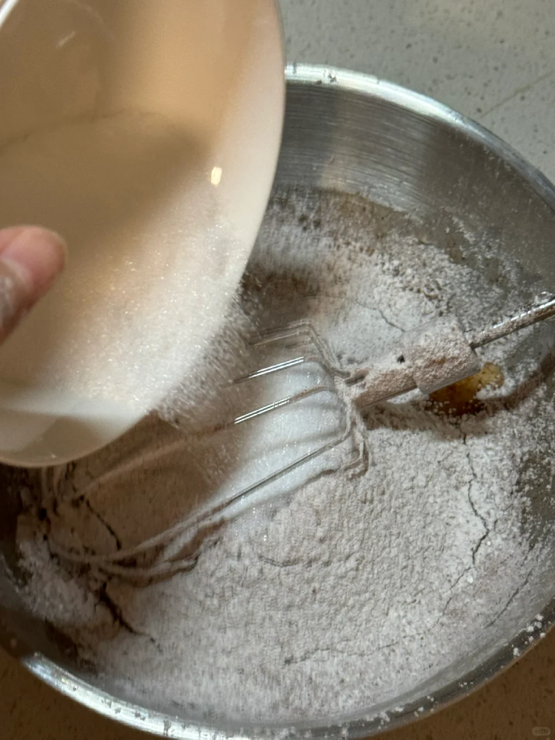 3.将过筛好的粉类倒入液体材料中,Z字型搅打至顺滑,面糊的状态是微微黏稠的。