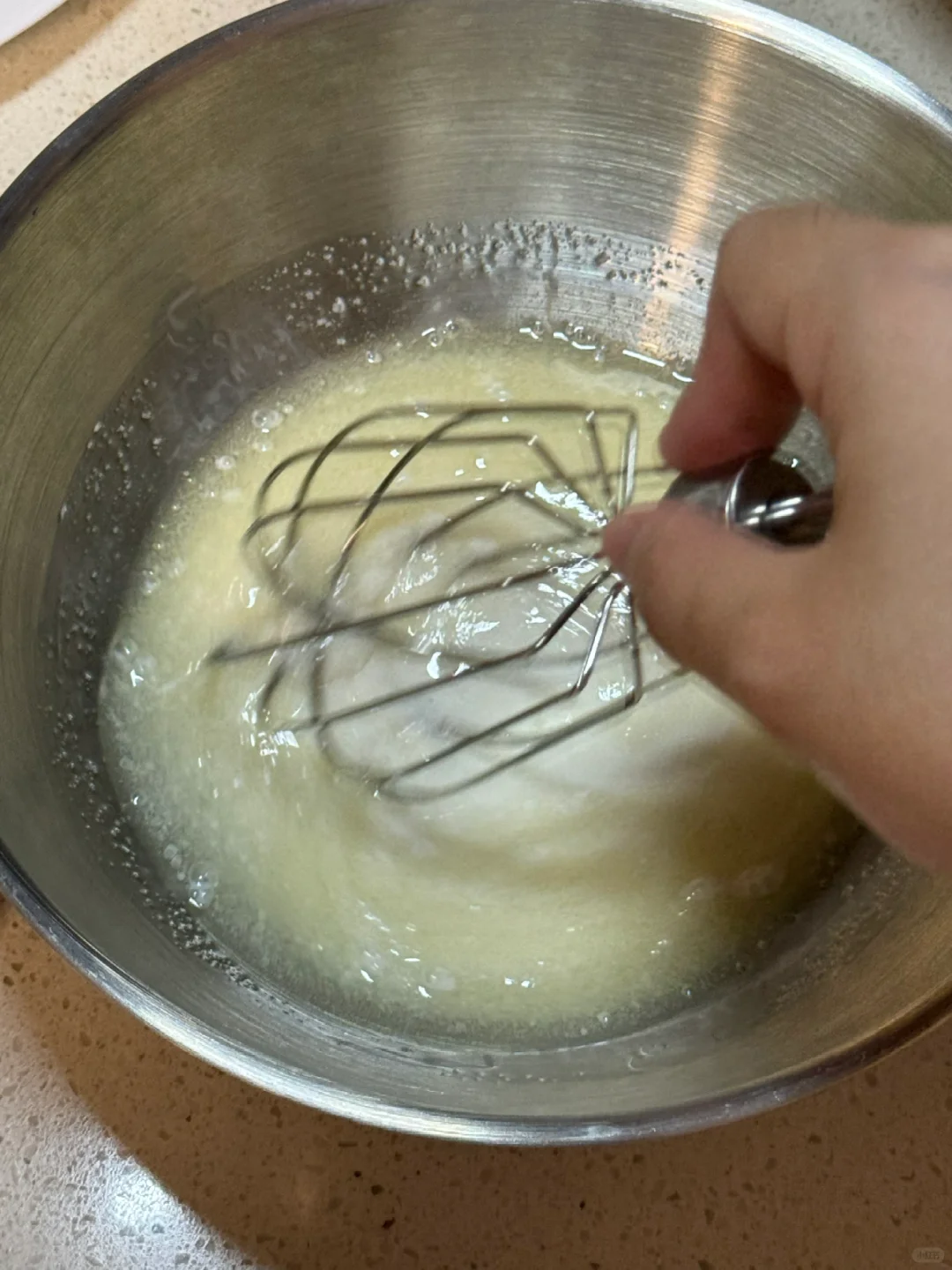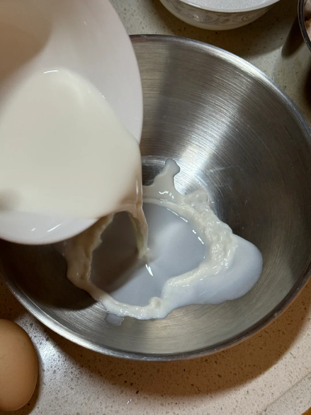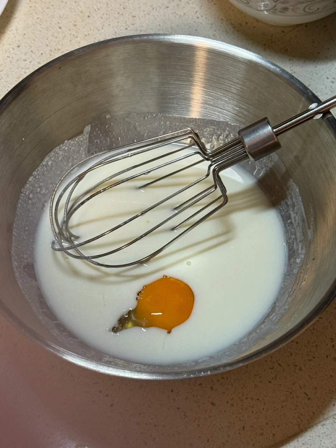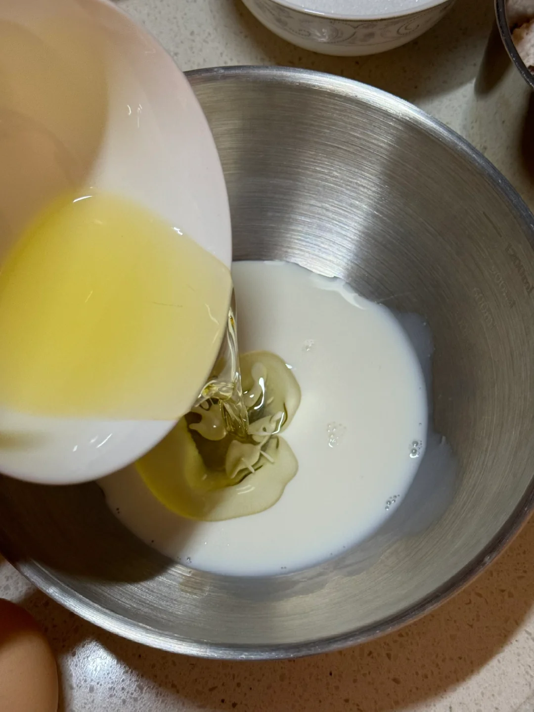 🌷做法:1.大碗中倒入纯牛奶、玉米油搅拌至乳化,再加入一个鸡蛋搅拌均匀。