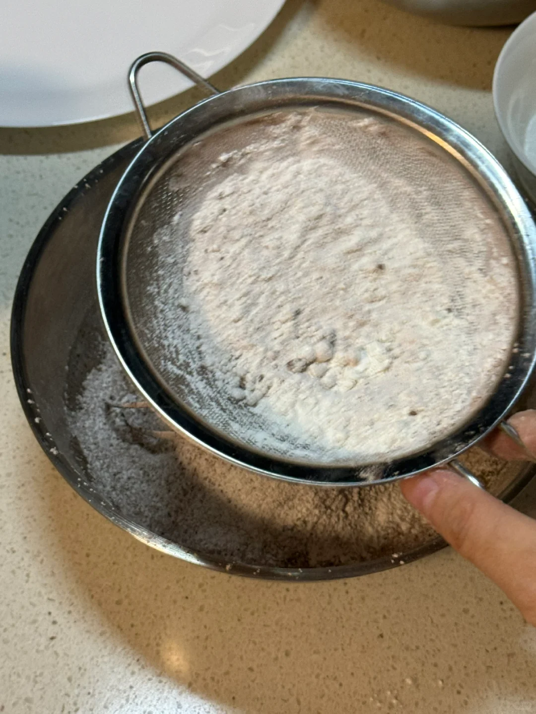 2.另外一个碗中把所有粉类过筛,加入细砂糖,混合均匀。