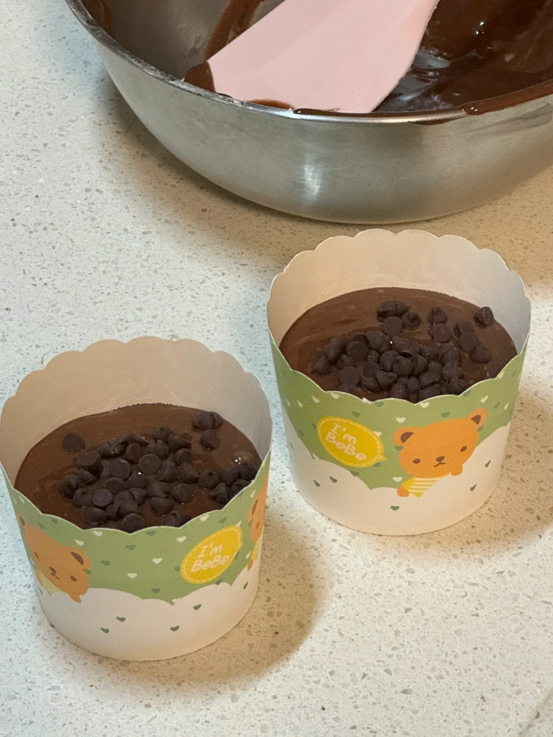 4.将调好的面糊倒入一部分加一些耐高温巧克力豆(蓝莓味的就加几粒蓝莓)再倒入面糊8分满,不要太满哦,不然烤的过程中会溢出来。