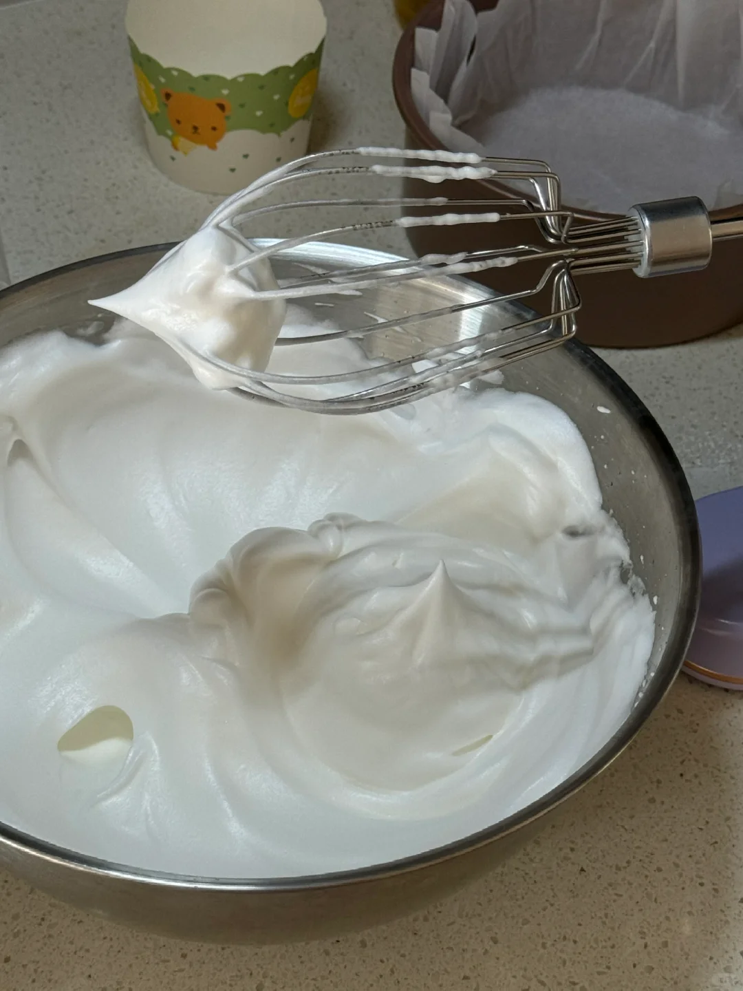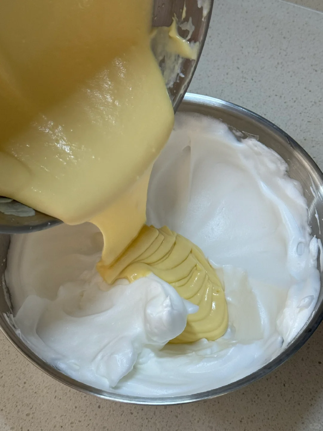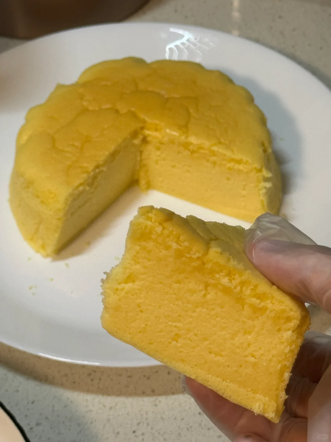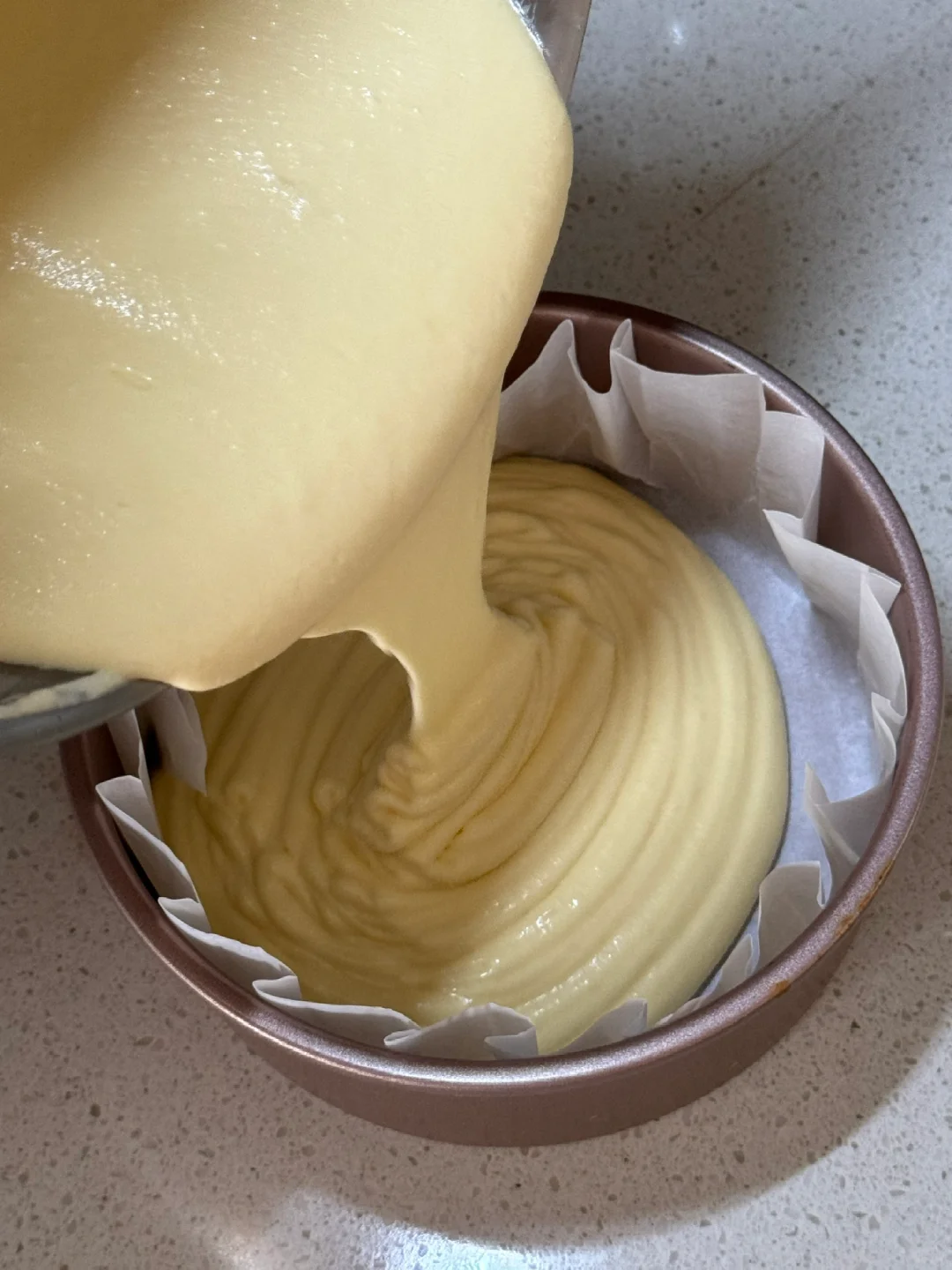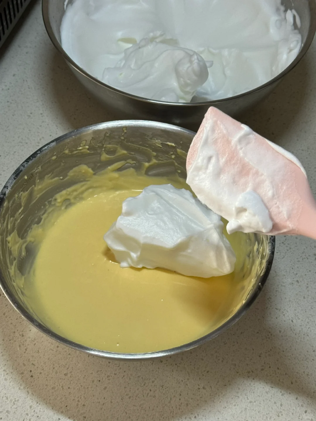 🌷食材:鸡蛋3个,淡奶油180g,低筋面粉75g,细砂糖30g,柠檬汁适量。 🌷做法:1.淡奶油、过筛后的低筋面粉,Z字型搅拌至无干粉,加入蛋黄搅拌至顺滑。 2.蛋清中加入柠檬汁、细砂糖,全程中速打发至提起有小尖角。 3.取一部分蛋白霜与蛋黄糊翻拌均匀,再倒回蛋白霜中、快速翻拌均匀,倒入模具中,轻震几下,放入预热好的烤箱,水浴法135度烘烤70分钟。 🌷出炉后晾凉,放冰箱冷藏一会儿,口感会更好,这款蛋糕比轻乳酪蛋糕更清爽,比戚风蛋糕更细腻,姐妹们快做起来吧[赞R][赞R][赞R]
