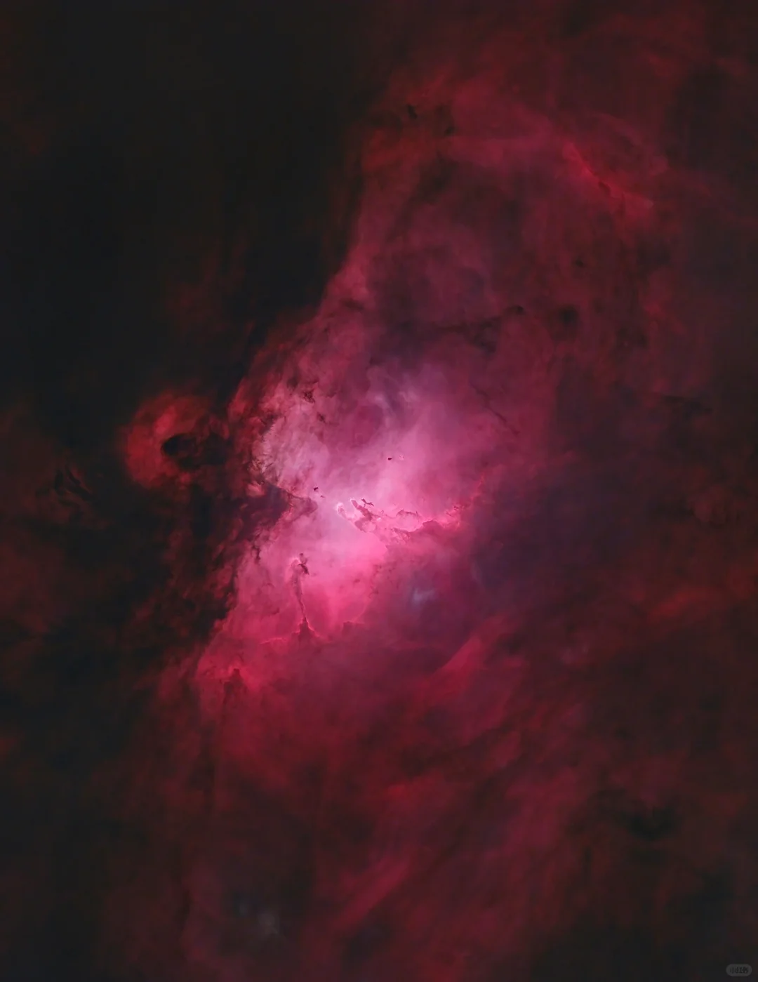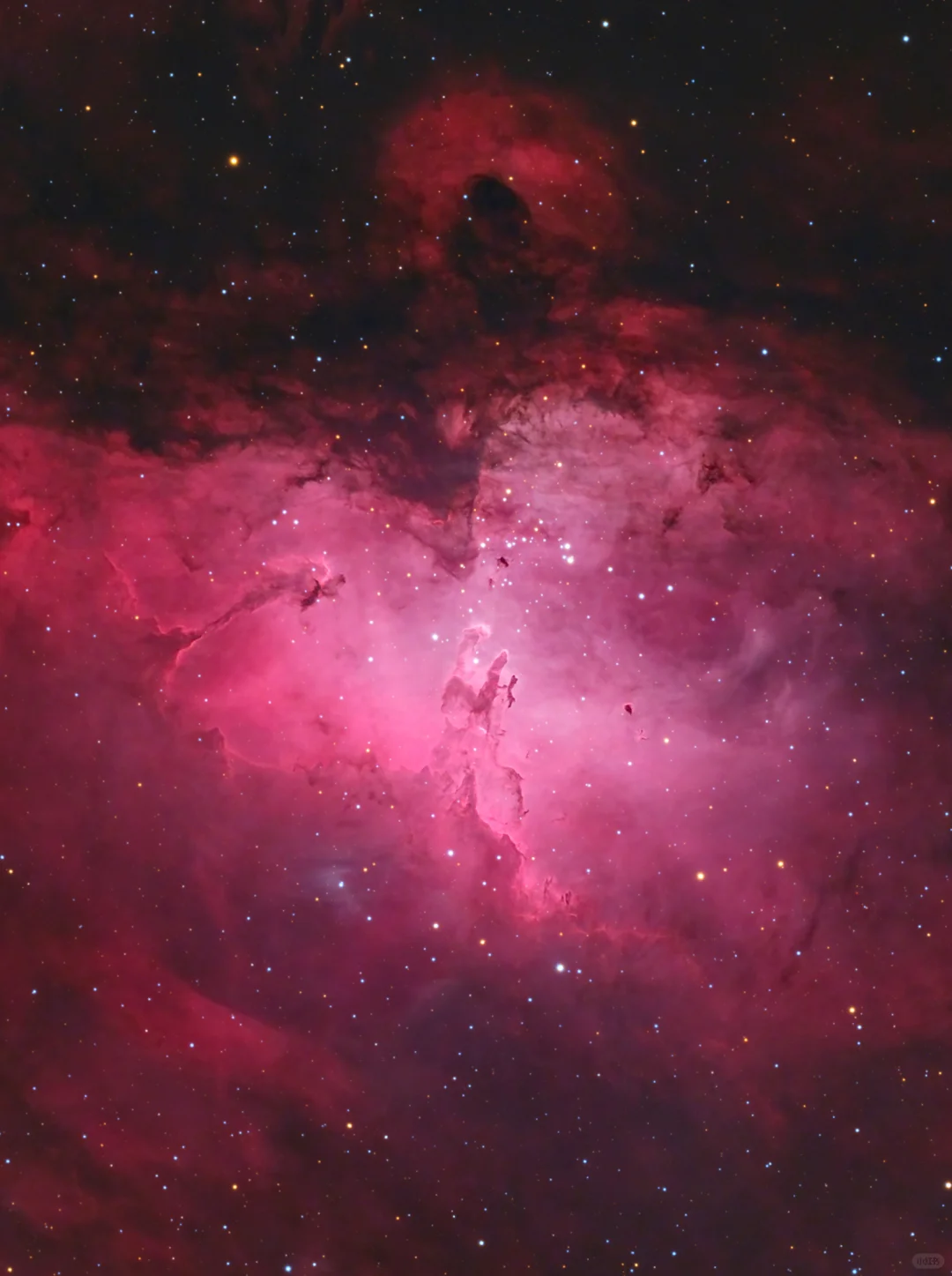 创生之柱(M16鹰星云核心部分)通常以SHO波段哈勃色(图4、5)呈现,经过摄影师后期的调色,可以展现出橙黄绿青蓝紫等丰富的色彩层次。那么它的真实色彩应该是什么样的呢?它是一片玫红色的电离氢区,更广域的画幅下,星云的形状像一个侧面人像。