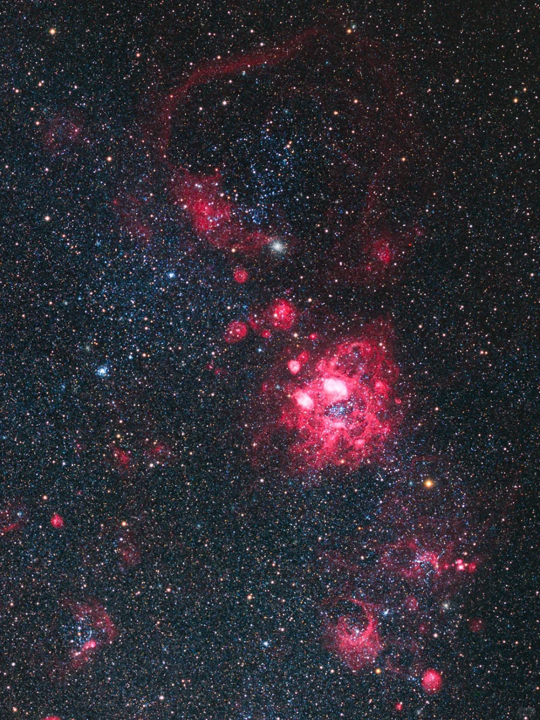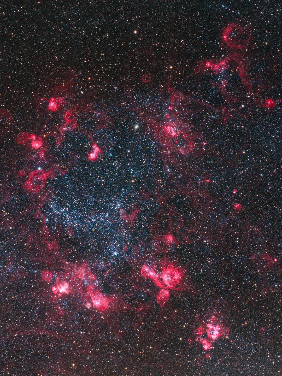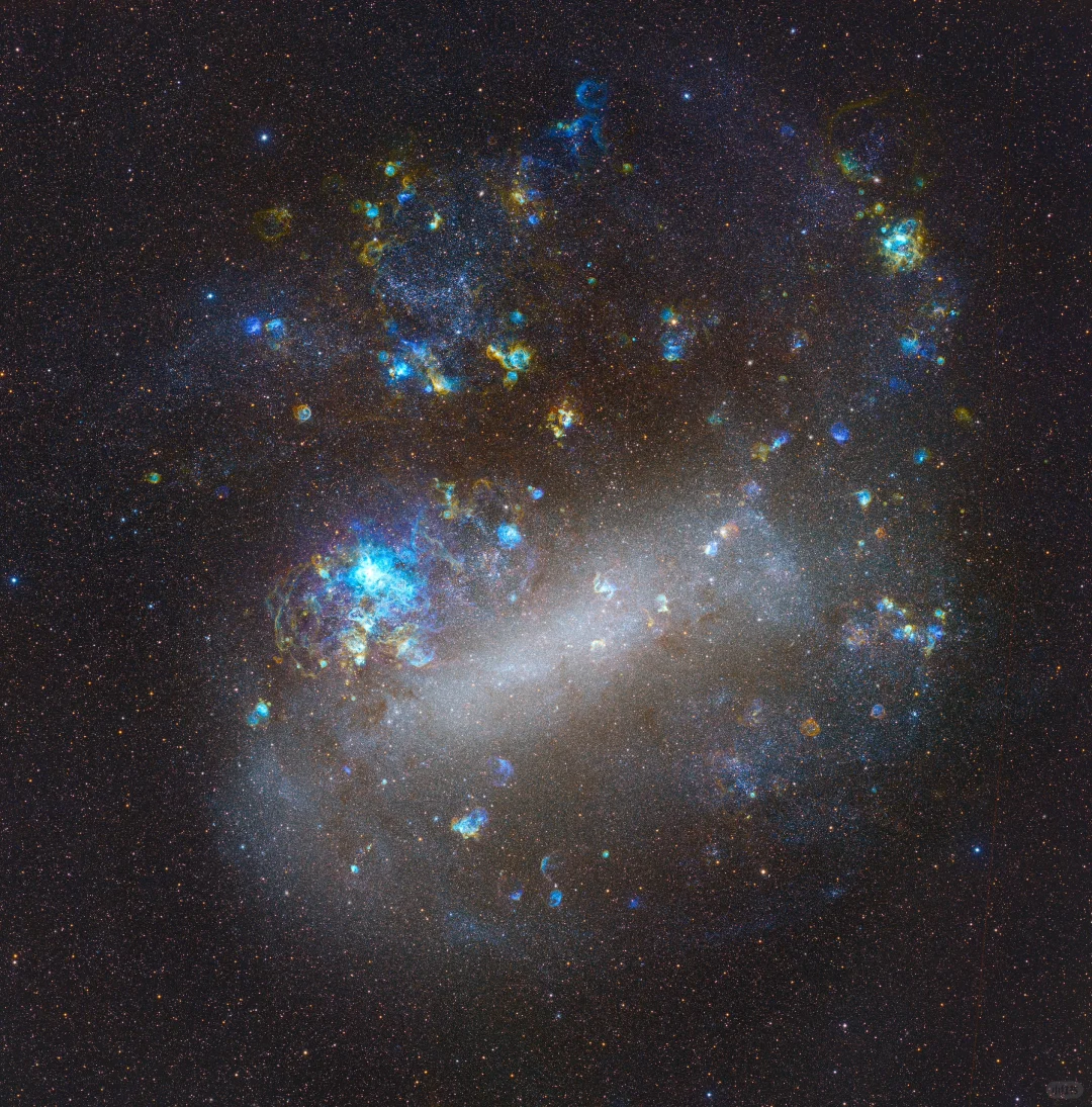 大麦哲伦星云又叫大麦哲伦星系,距离我们仅16万光年,直径约2万光年,是地球上肉眼可见最大的深空天体,约12个满月的视直径,其中包含着数以亿计的恒星、星云和星团。这两张照片分别为LRGB+Ha和LRGB+SHO通道的后期效果。可惜的是这个巨大的邻居星系只能在南半球或北半球低纬度地区观测到。本素材由Alpha智利台拍摄,本人后期处理。