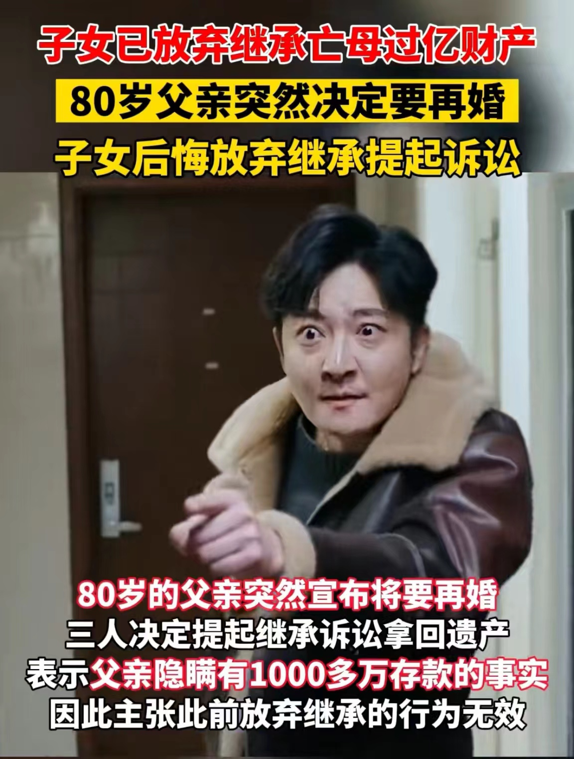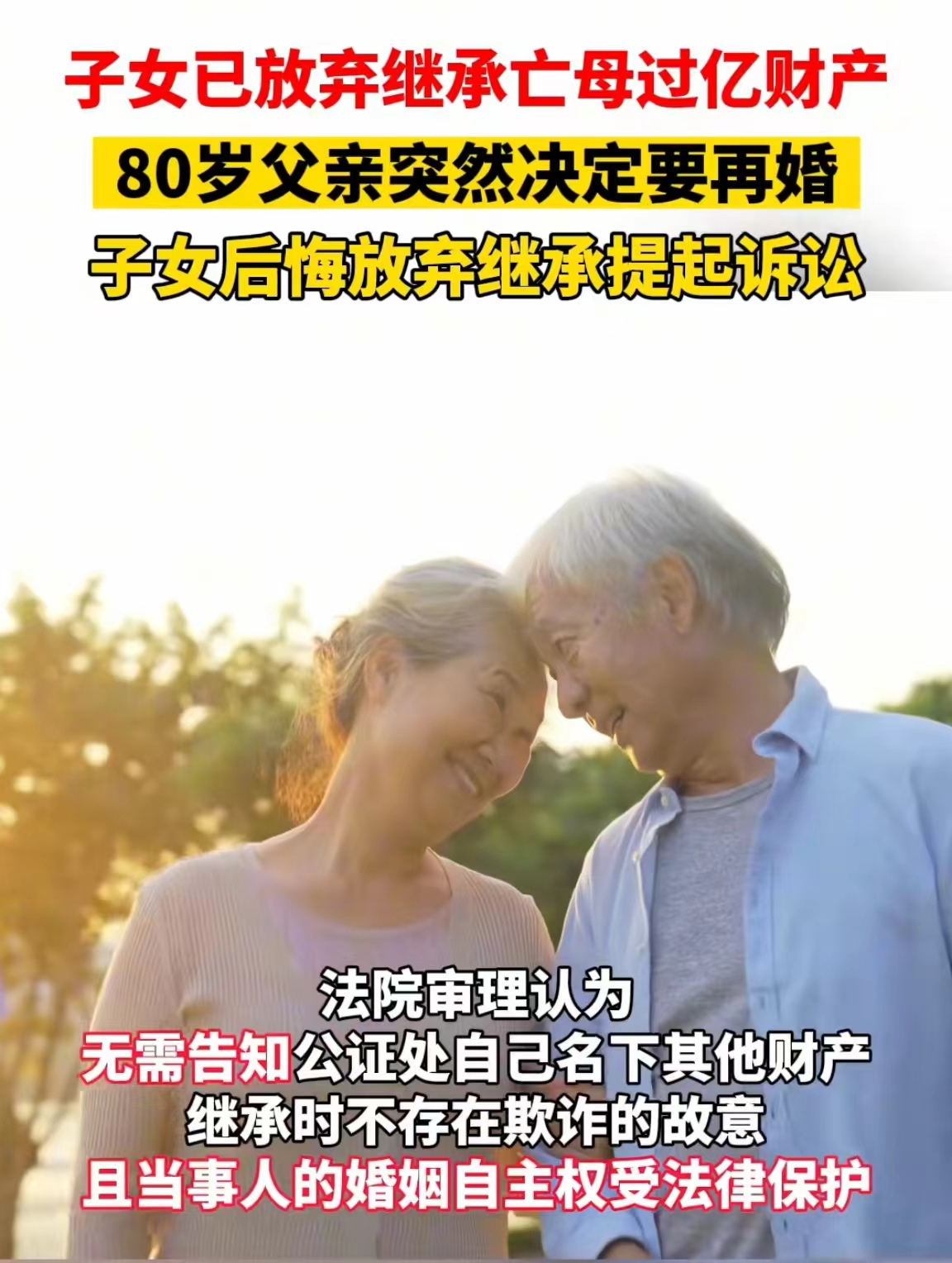 上海,一女子在母亲去世后,三兄妹均表示放弃遗产继承,将价值过亿财产留给父亲,让父亲能在年迈时有丰厚的经济基础,以安享晚年,没想到,80多岁的父亲,迷恋上一年轻女子,不听任何人劝阻,执意要给女子名分,女子担心家产旁落,将父亲诉诸法庭,要求重新继承亡母留下的遗产,法院如何判?