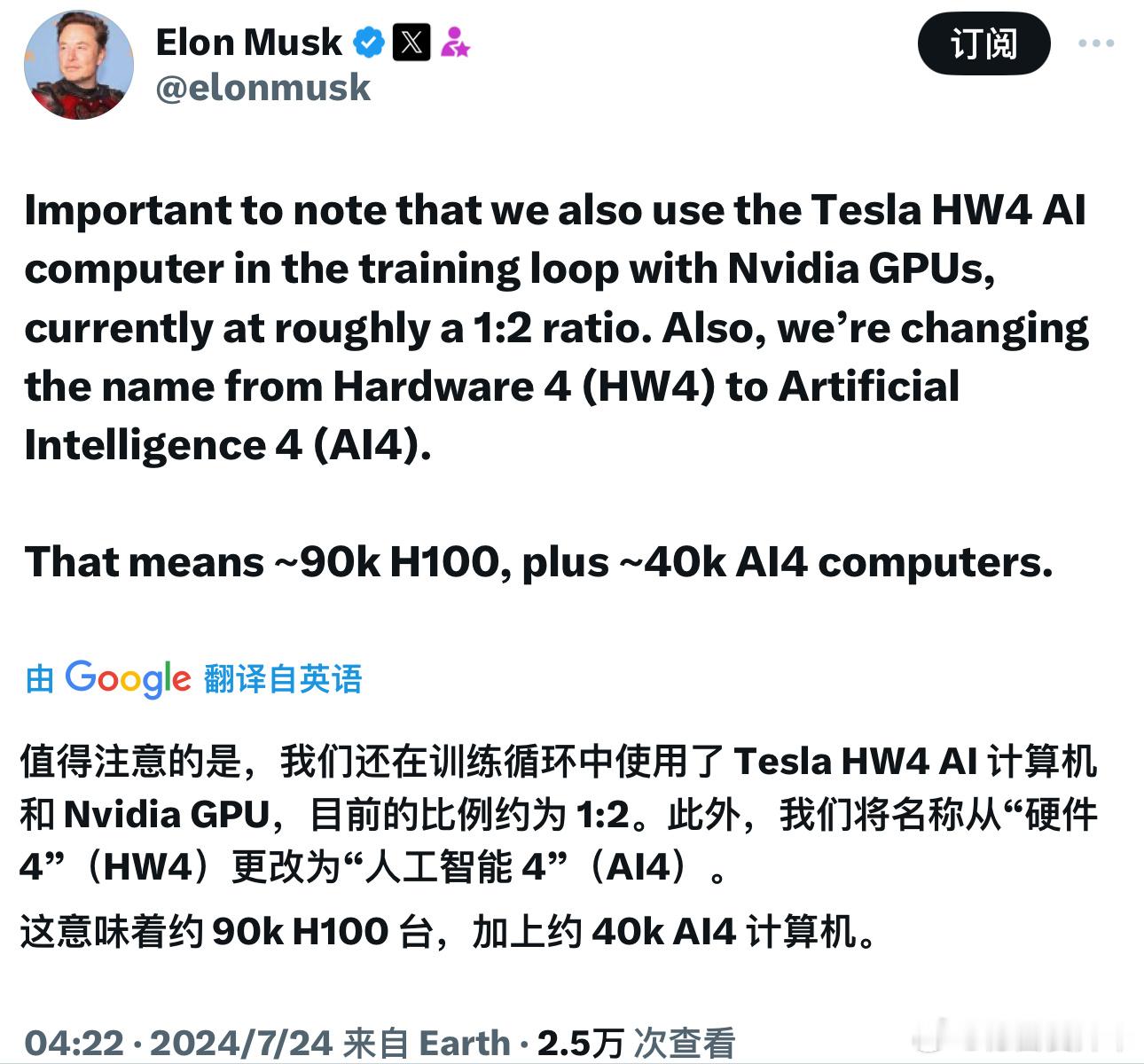 特斯拉 HW4 计算平台今天也正式更名为 AI4。