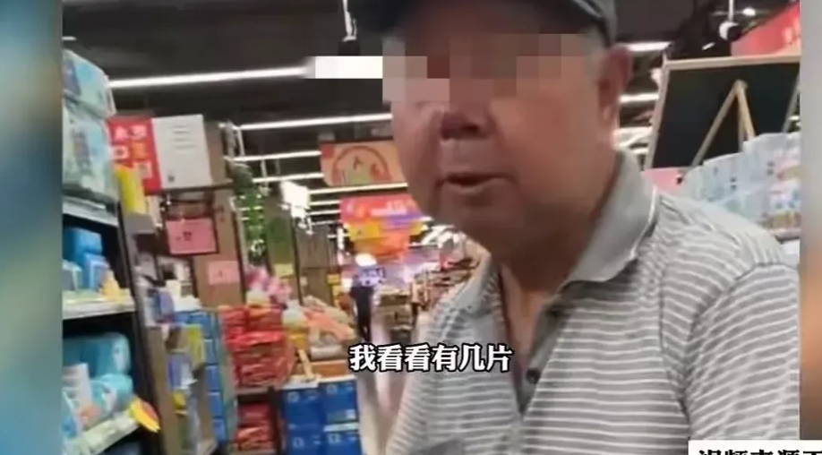 只见一个老大爷进来超市后,先是左顾右盼,趁着没人的时候,径直来到摆放卫生巾的货架,然后熟练的拆了包装,还用手摸了摸……