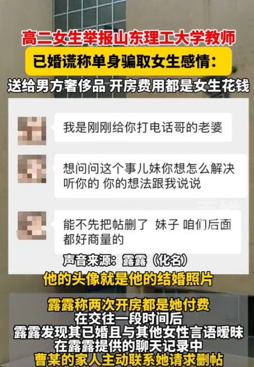 山东淄博,一女高中生喜欢上了一名大学男教师,她还花钱与男教师去高档酒店开了房。女生本以为遇到了真爱,结果却发现这名男教师不仅冒充单身骗自己的感情,还与别的女性有暧昧关系。女生一怒之下,举报了这名男教师。目前,男教师已被学校处分及解聘,并被剥夺了教师资格。