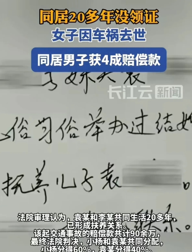 这就是只同居不领证的下场?江苏一老伯,跟一大妈共同生活20多年,双方没有登记结婚,大妈车祸去世,获赔90万,大妈跟前夫生的儿子认为这90万应该给自己,可老伯却说他和女子以夫妻名义共同生活居住20多年,理应分得赔偿款。法院的判决结果亮了。