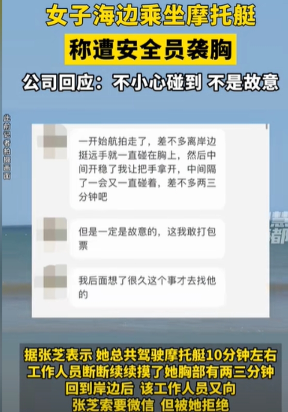 他摸我胸!福建平潭,张芝与朋友到海洋公园玩,花240元玩摩托艇,结果摩托艇刚离开岸边,安全员就把手放她胸部,她怒斥让对方放开,但过了两分中,安全员的手又摸了上去,回到岸边后,安全员还想要张芝的微信,被拒绝。公司回应:不是故意的!