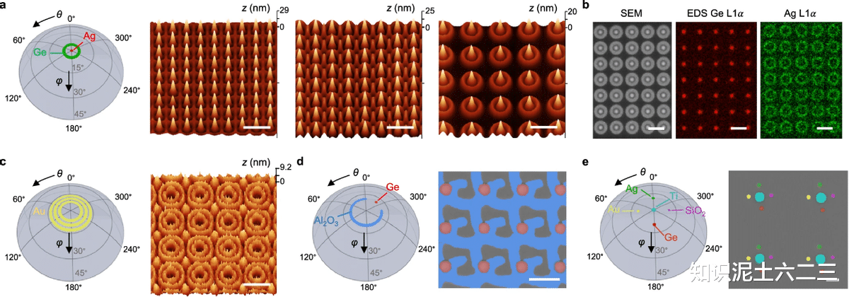 科学家们用这个技术制作了很多超晶格图案。比如,先制作一个由银形成的空干涉图案,看起来像华夫饼或者环形;然后再用锗制作锥形图案,这些锥形能完美地和之前银图案的空洞中心对齐,就像钥匙和锁孔一样精准匹配。还有一些更复杂的图案,像花形、手性对称破缺图案,甚至是由5种材料组成的五元超晶格,这些图案的制作展示了MBHL技术的强大能力。