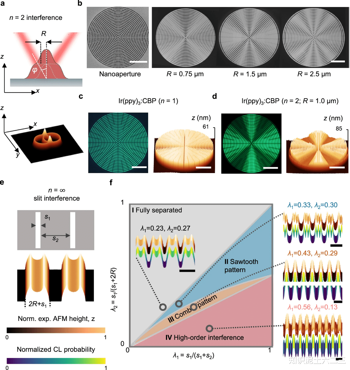 一维干涉图案:一维干涉图案是MBHL技术的一个小试牛刀的成果。以n=2干涉为例,就像有两束调皮的分子束,从不同方向穿过环形纳米孔,在基板上叠加出一个波浪形的3D表面,这个表面上材料堆积的地方就像小山峰一样。通过控制一些参数,还能做出很多不同的莫尔干涉图案,比如用金做的图案,就像一个个精心设计的小艺术品。