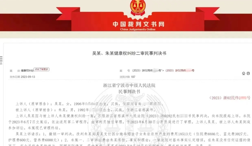 (信息来源:中国裁判文书网《浙江宁波市中级人民法院吴某、朱某健康权纠纷二审民事判决书》)
