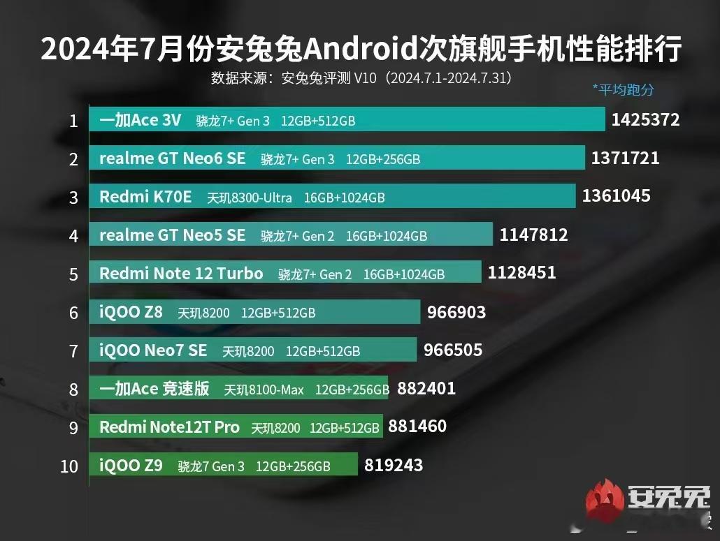 7月安兔兔安卓手机性能榜发布,这一加有点显眼啊[并不简单]一加Ace 3 Pro
