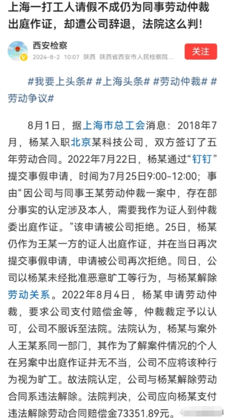 公司再次拒绝了杨娟的请假申请,可杨娟依旧仗义出庭。