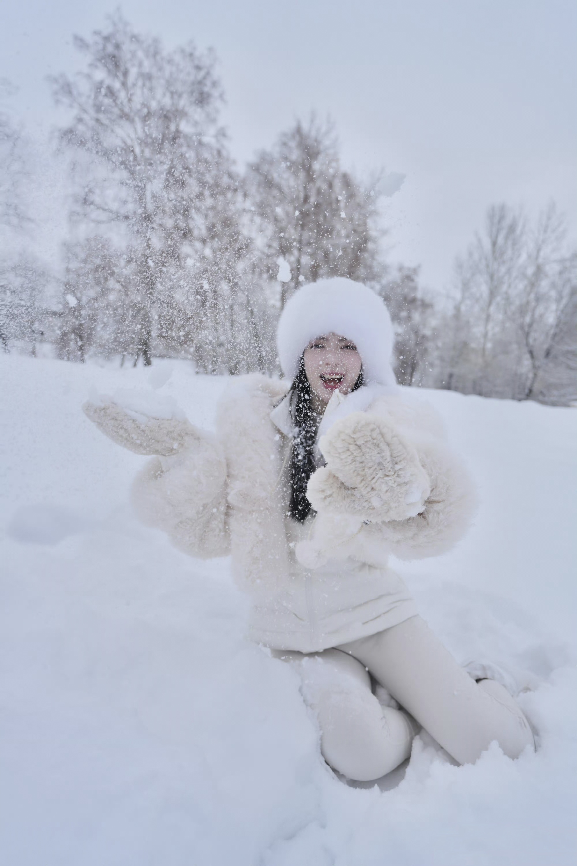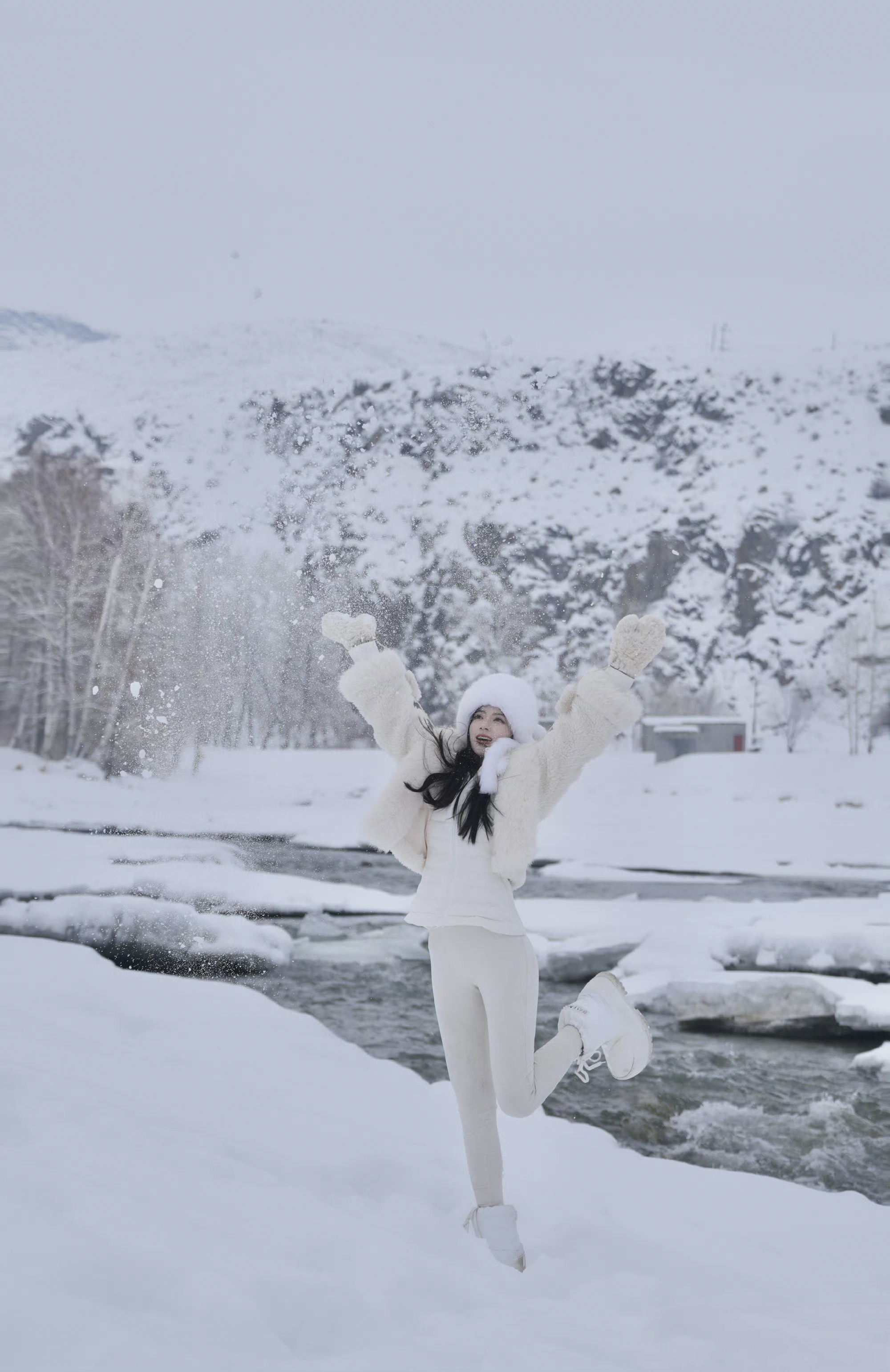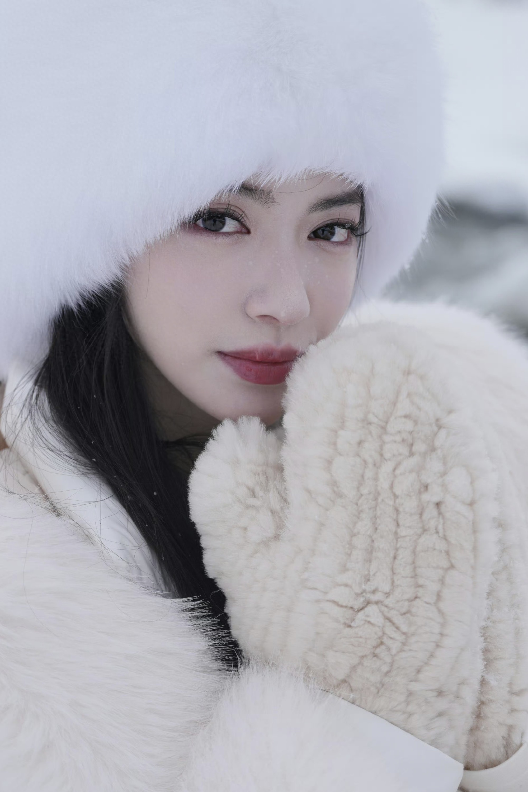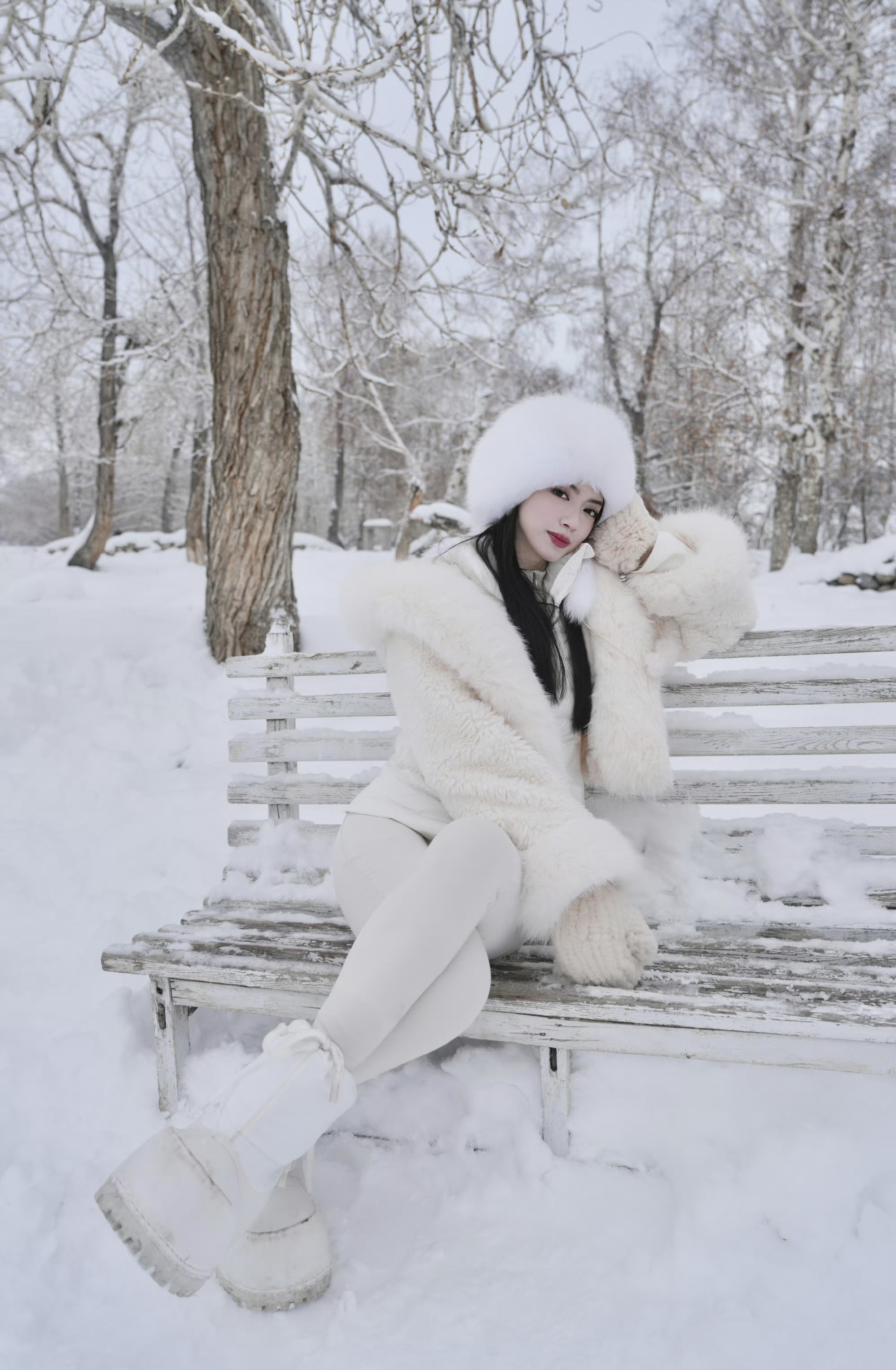 雪是这组写真的灵魂底色。漫山遍野的白,将天地晕染成一幅素净的水墨长卷,枝头凝霜,地面铺玉,连空气里都似飘着细碎的雪绒。镕馨的穿搭与这片雪境浑然一体:白色的毛绒帽檐垂落着柔软的毛边,将她的脸庞衬得愈发清丽;毛绒外套蓬松而温暖,与雪地的质感相映成趣,内搭的修身白衫又勾勒出灵动的线条,在厚重与轻盈之间,拿捏出恰到好处的平衡。她坐在覆雪的木椅上时,手肘轻抵膝头,侧脸贴向掌心,眉眼间似有淡淡的温柔,又藏着一丝江湖儿女的疏朗,仿佛是雪山深处等待归人的女子,守着一方静谧,也藏着一腔故事。