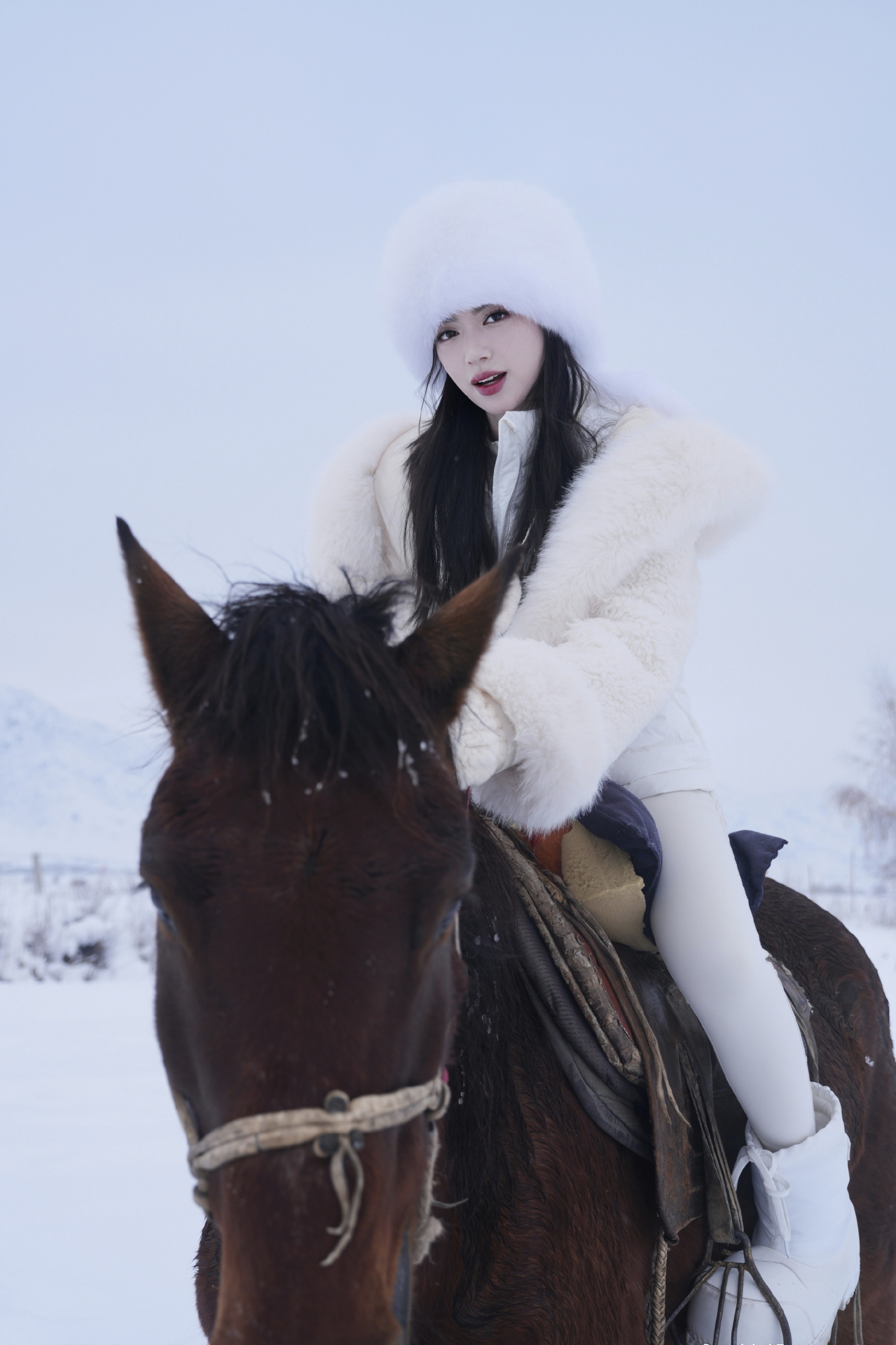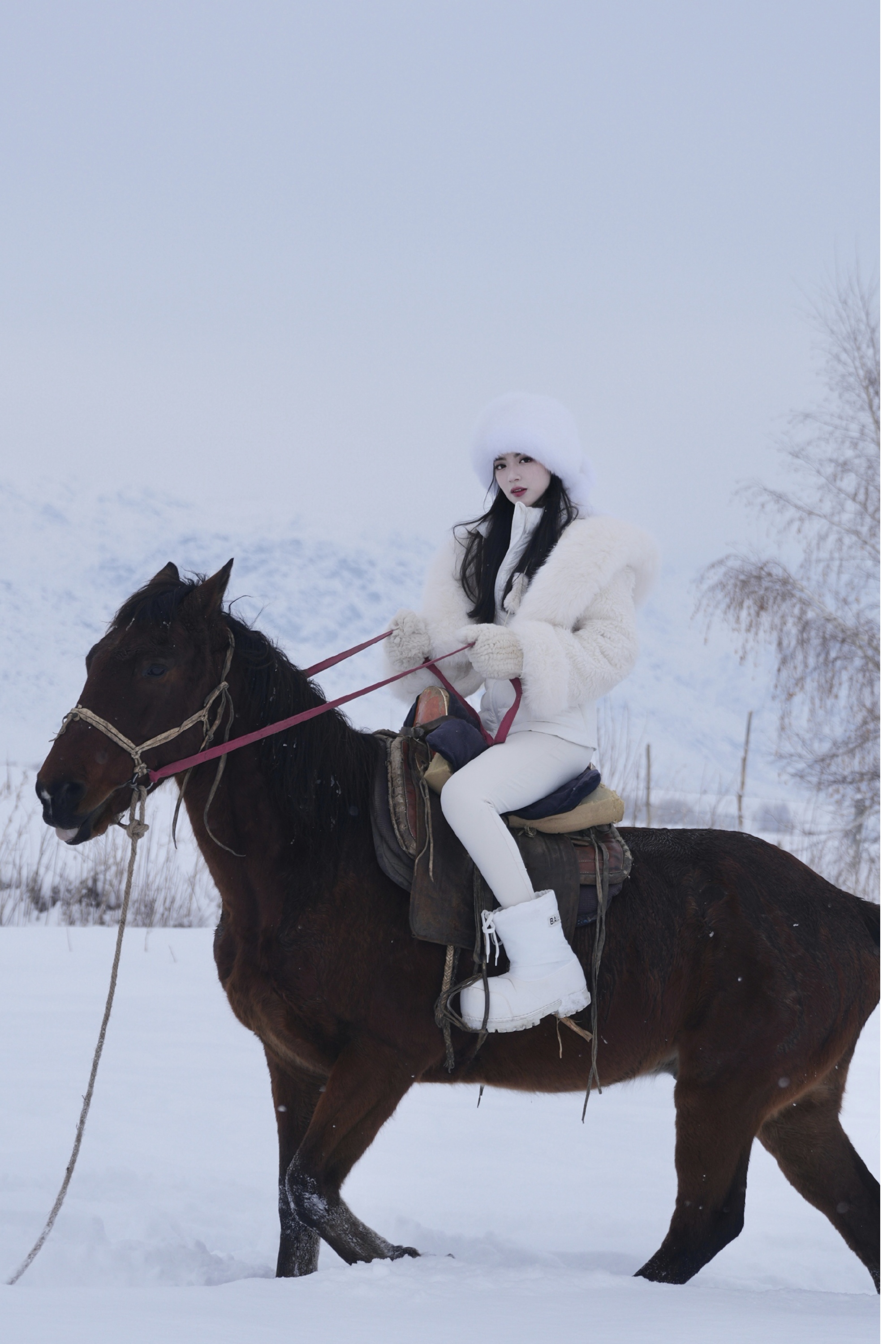 而当她骑上棕红骏马,画面便多了几分武侠的豪情。深棕色的马身与纯白的雪境形成鲜明对比,马蹄踏碎雪面的寂静,镕馨端坐马背,手握缰绳,目光望向前方,那一刻,她不再只是雪地里的柔美佳人,更像纵马江湖的侠女,带着几分飒爽,几分洒脱。马是雪域里最灵动的生灵,也是武侠世界里侠客的知己,一人一马在雪野中前行,背景是连绵的雪山与萧瑟的林木,时光仿佛在此刻慢下来,让人恍惚间觉得,她正奔赴一场江湖之约,或是在雪山深处续写着属于自己的传奇。