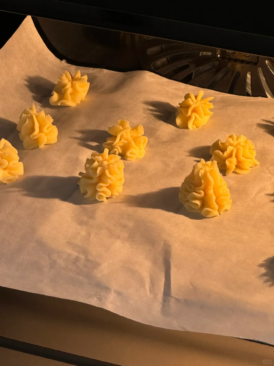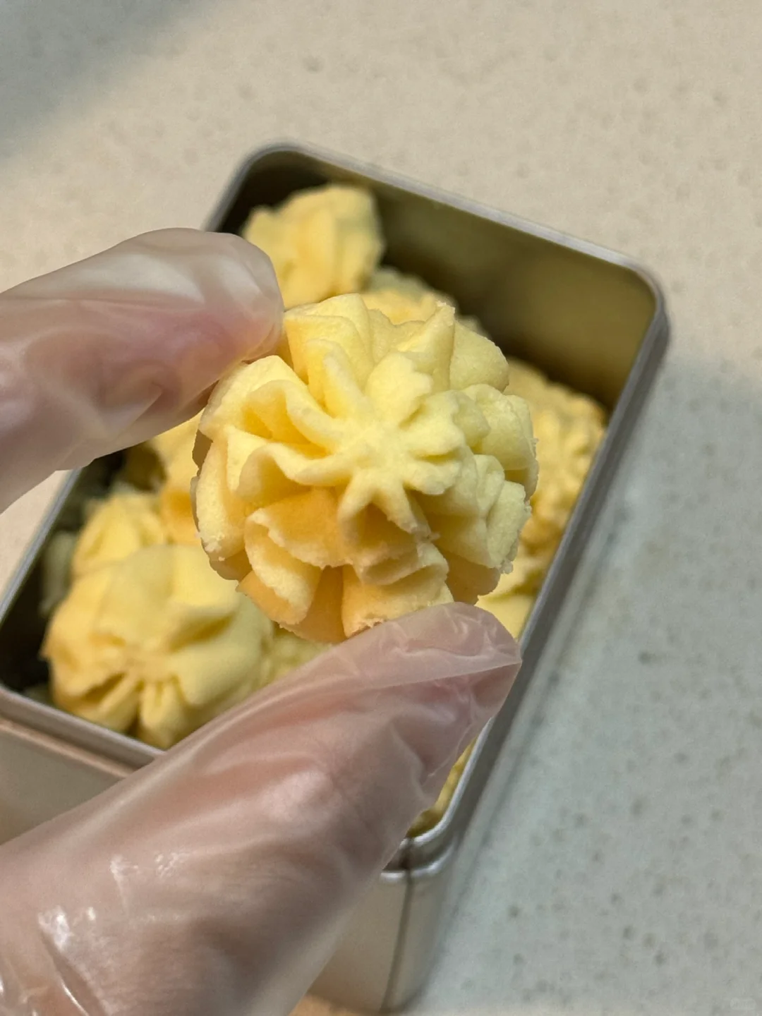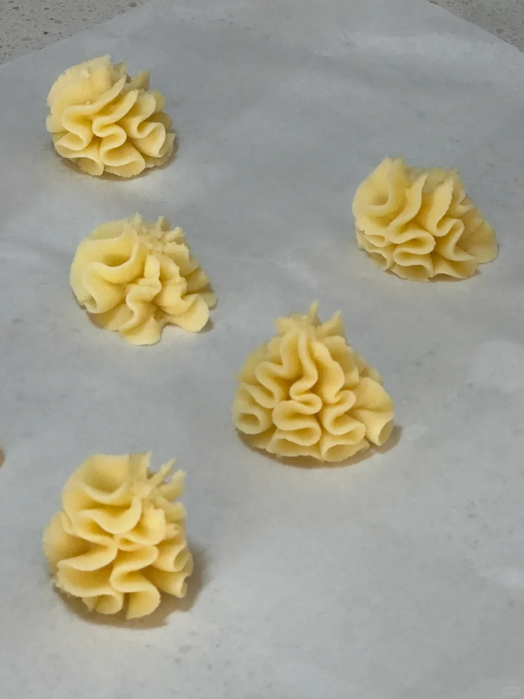 🌷食材:黄油110g,糖粉25g,食盐1g,玉米淀粉55g,低筋面粉45g,高筋面粉40g。 🌷做法:1.提前软化黄油,糖粉、盐与黄油用打蛋器打发均匀。 2.筛入玉米淀粉(玉米淀粉是曲奇酥的关键)打发至体积发白,筛入高筋面粉和低筋面粉,用刮刀压拌均匀,呈细腻的面糊糊。 3.用8齿的裱花嘴,挤入烤盘,烤前需要冷藏半小时,再预热好烤箱,140度烘烤30分钟(第一次挤,挤的不是很完美,之后要多加练习,但这个配方真的好好吃!!!) 🌷经典原味是真的不错,快去试试吧!